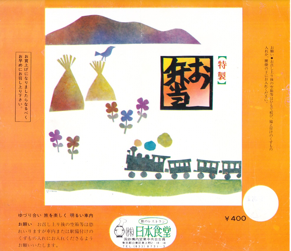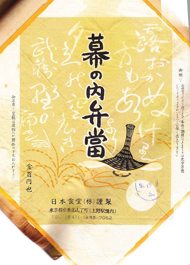 1989(平成元)年6月28日の調製と思われる、昔の上野駅弁の掛紙。ジェイ・ダイナー東海でなく日本食堂の駅弁に「J・Diner」のマークがあるのは間違いでなく、このCIを導入した後に分社したため、両社で同じものを使用した。当時はこの両社とも、甲乙丙の幕の内駅弁を抽象的な名前と絵柄で販売していたと思う。