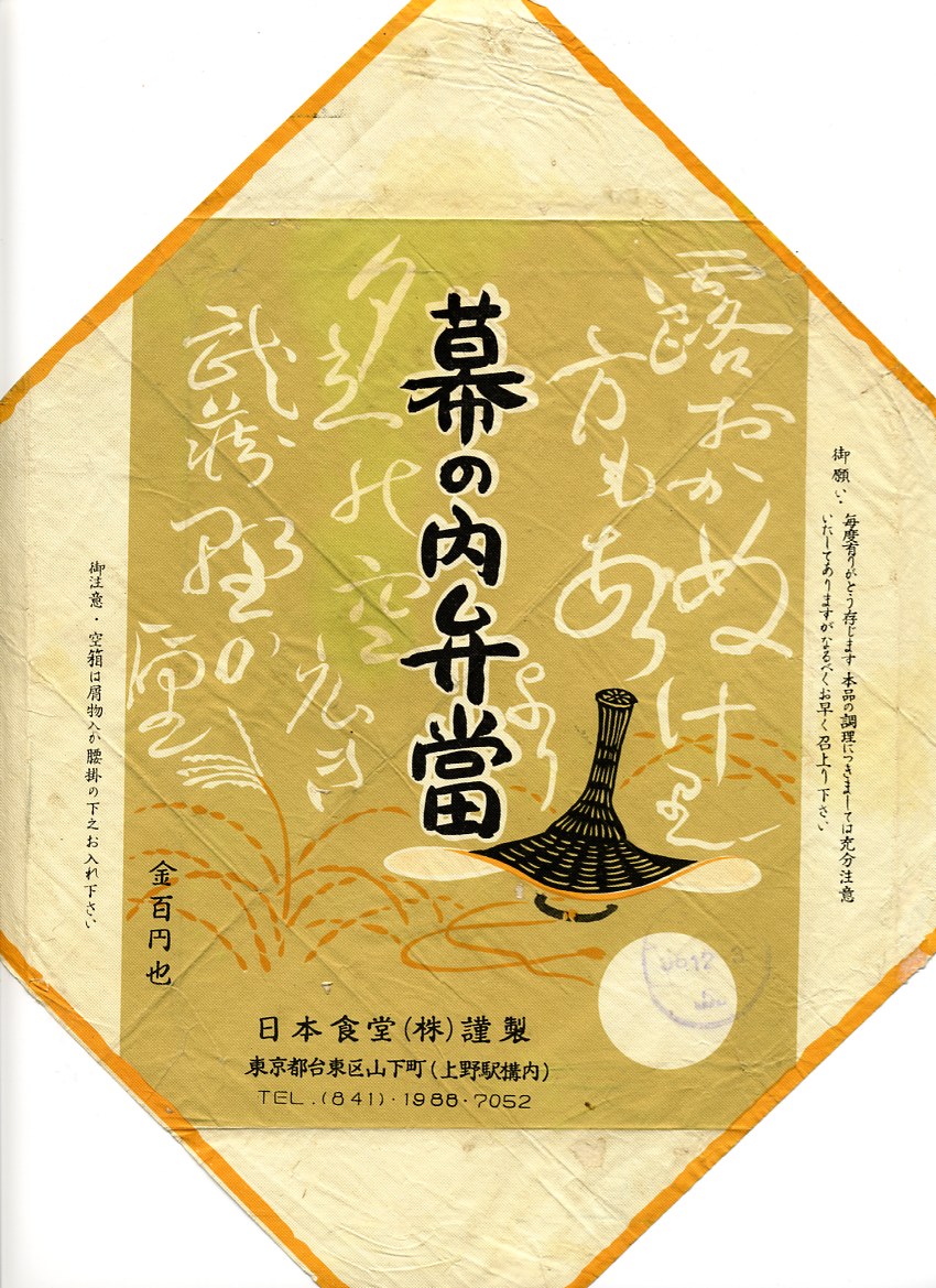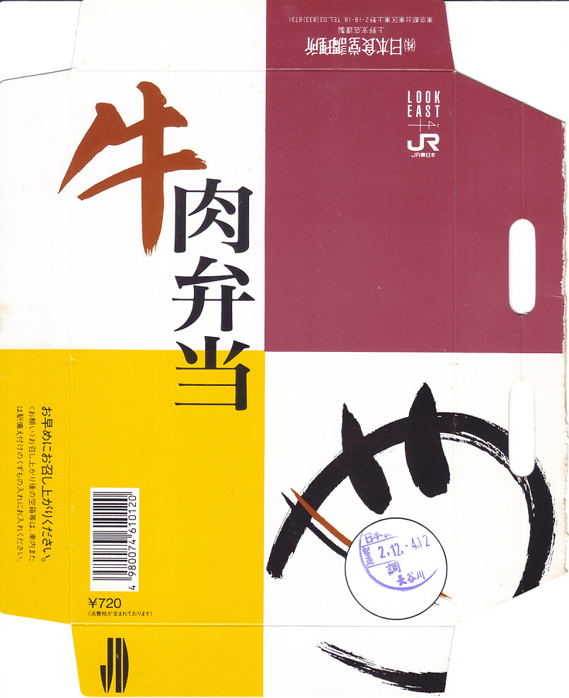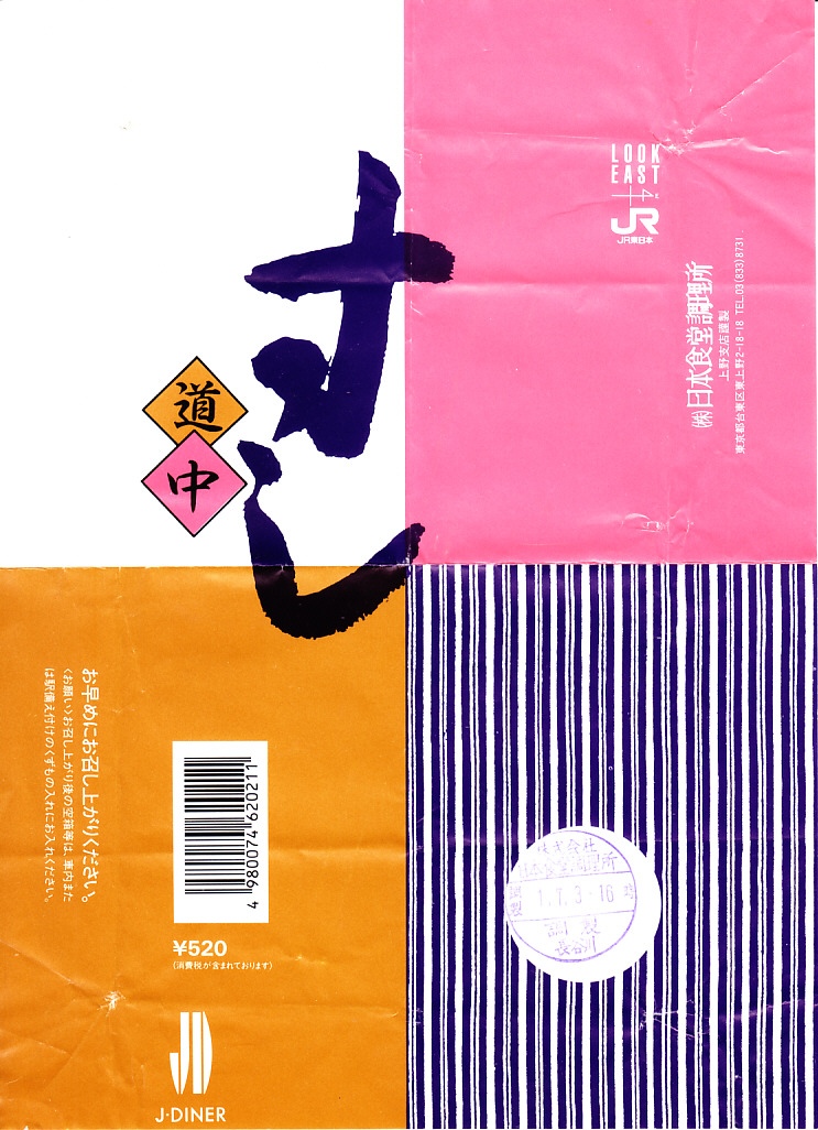 1990(平成2)年12月14日12時の調製と思われる、昔の上野駅弁の掛紙。右上にJR東日本の観光キャンペーン「LOOK EAST」のロゴマークが、左下に日本食堂のロゴマーク「JD」がみえる。日本食堂の上野支店の調製なので、ここでは上野駅弁としたが、在来線の東京駅でも売られたと思う。東北新幹線が東京駅に乗り入れたのは、1991(平成3)年6月のこと。