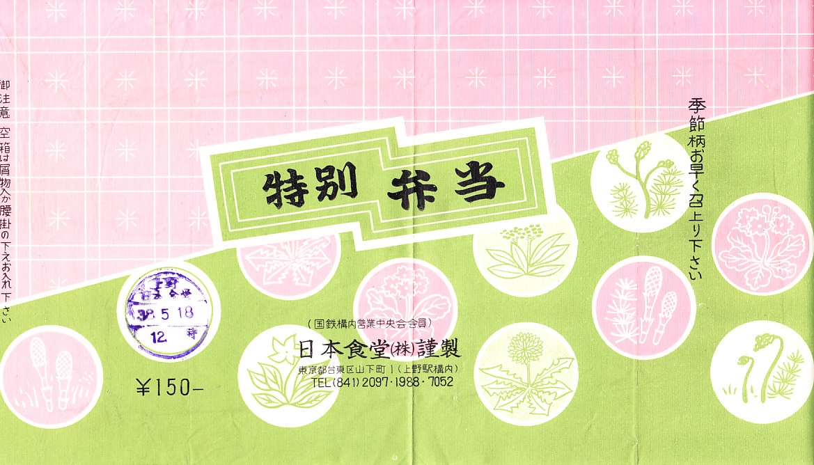 1963(昭和38)年5月18日12時の調製と思われる、昔の上野駅弁の掛紙。いくつもの草花のアイコンで、特別な感じは出ただろうか。「駅弁日本一周」(早川書房)にこの弁当に関する記述があり、江戸前ボタンエビの天ぷら、神戸牛のソテー、小田原かまぼこ、千葉の地鶏の玉子焼、葛西のハス、秋田のきゃらぶき、土佐のタケノコを入れた弁当だったそうな。