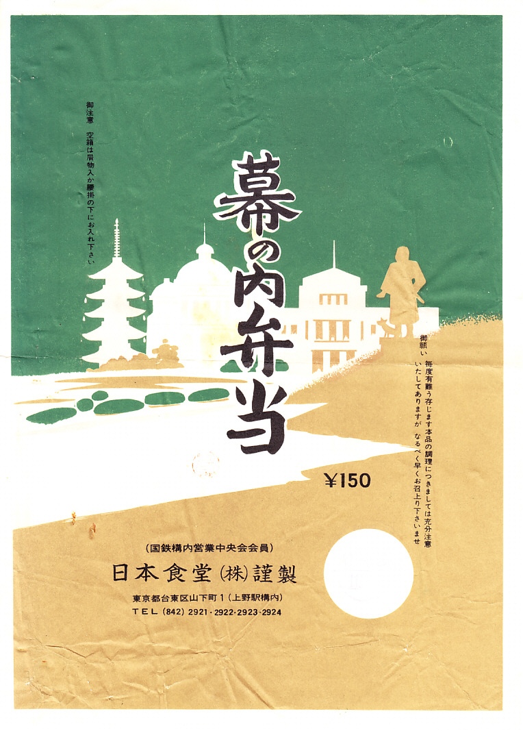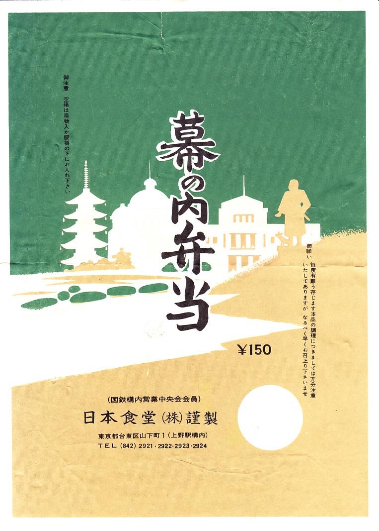 1965(昭和40)年3月26日の調製と思われる、昔の上野駅弁の掛紙。右から西郷隆盛像、何か西洋風の建物、東京国立博物館、旧寛永寺五重塔が並ぶ。同じ年月日で2枚の掛紙を入手。