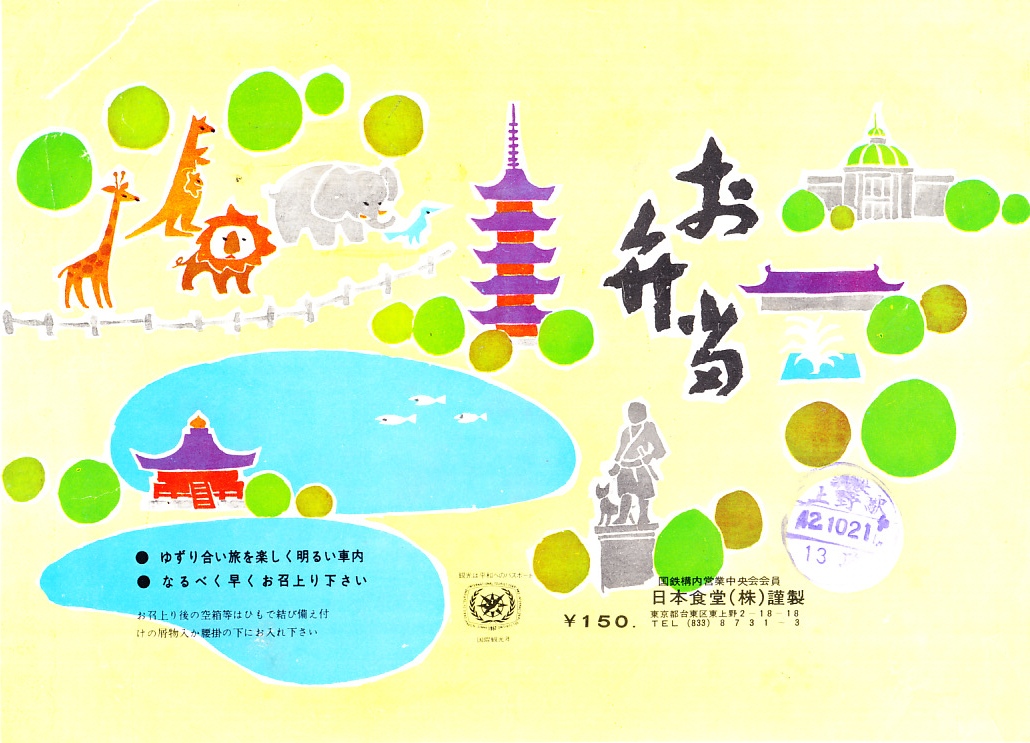 1967(昭和42)年10月21日の調製と思われる、昔の上野駅弁の掛紙。絵柄に上野動物園の動物たちが加わり、賑やかになってきた。