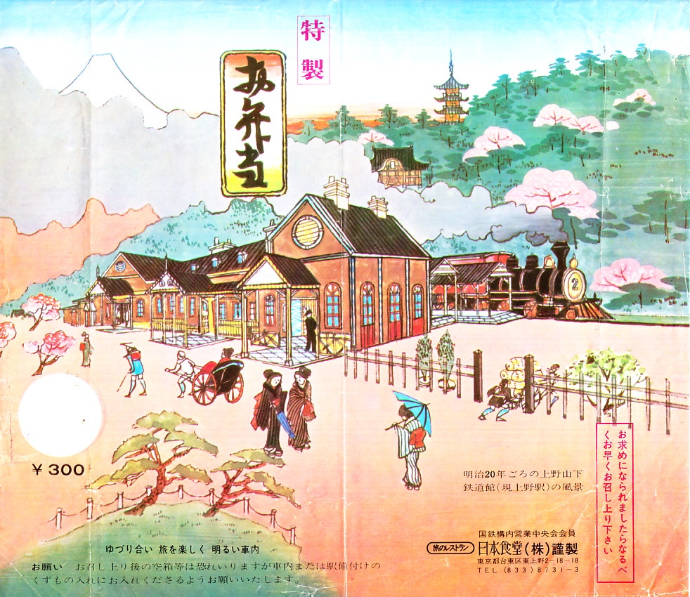 1970年代のものと思われる、昔の上野駅弁の掛紙。「明治20年ごろの上野山下鉄道館(現上野駅)の風景」を描いたそうな。