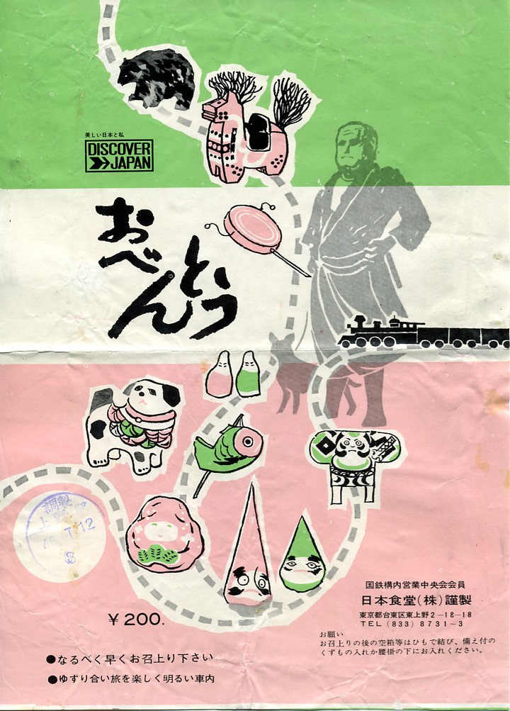 1971(昭和46)年7月12日8時の調製と思われる、昔の上野駅弁の掛紙。掛紙に描かれる西郷さん銅像を除くアイテムは、東北各地の郷土玩具か。