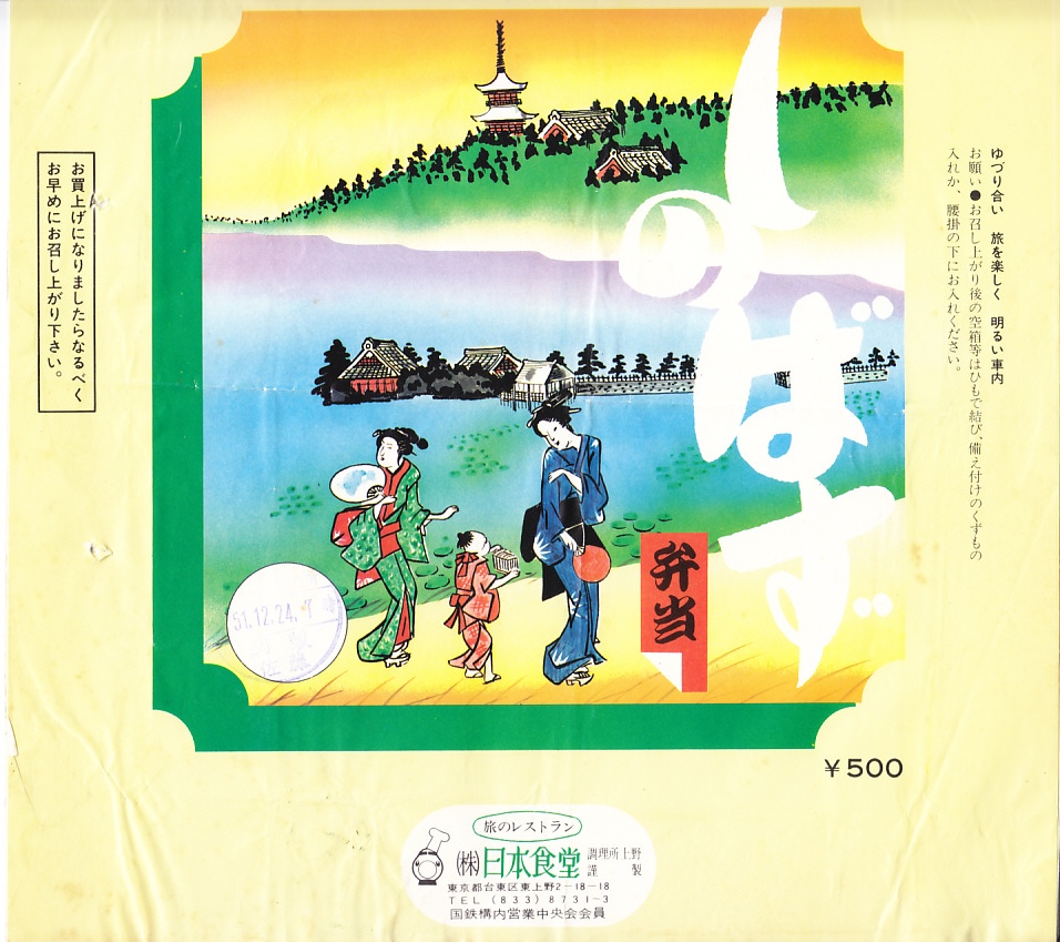 1976(昭和51)年12月24日7時の調製と思われる、昔の上野駅弁の掛紙。駅の隣の不忍池(しのばずのいけ)や寛永寺(かんえいじ)を描いたのか、どうもそうには見えない絵柄を使う。