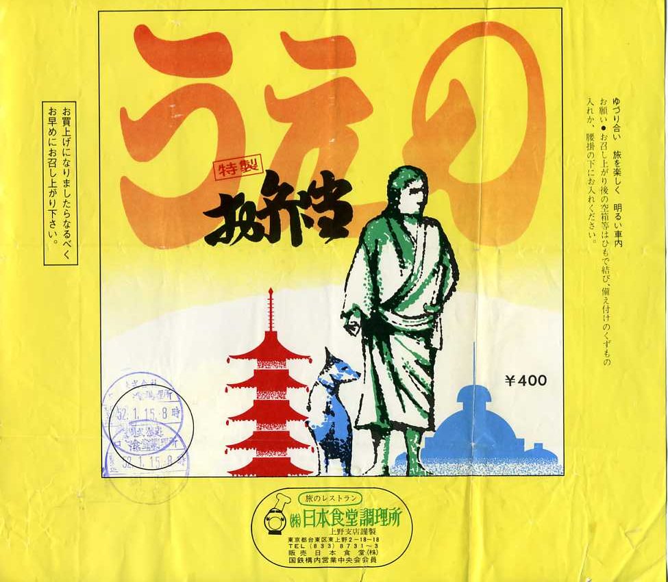 1977(昭和52)年1月15日8時の調製と思われる、昔の上野駅弁の掛紙。うえのと掛紙に大きく書かなくても、西郷さんの銅像を描くだけで上野が表現できるのは便利だと思う。