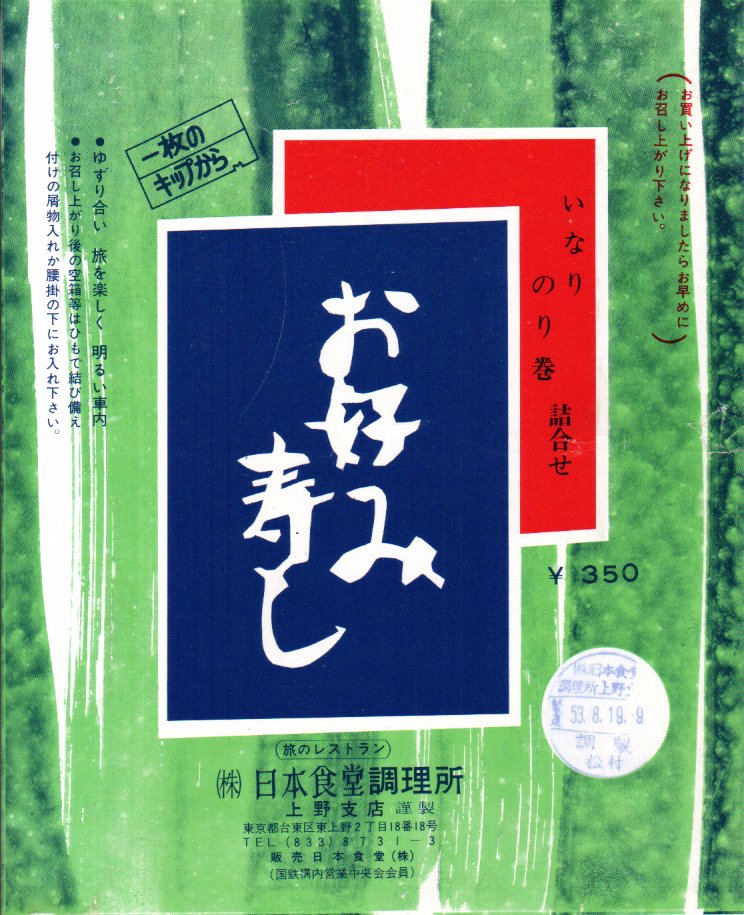 1978(昭和53)年8月19日9時の調製と思われる、昔の上野駅弁の掛紙。現在は東京駅弁も上野駅弁も埼玉県戸田市の調理センターで調製されるが、当時は東京駅弁を港区港南の調理所で、上野駅弁を台東区東上野の調理所で調製していた。