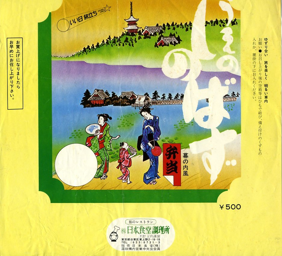1980年代頃の調製と思われる、昔の上野駅弁の掛紙。上野らしい駅弁の名前だが、つまり中身は日本食堂の幕の内弁当ではないかと思う。イラストは上野公園にある不忍池だろう。今は小さく浅い文字通りの池だが、江戸時代まではもっと大きな池だったらしく、しかし全部が埋め立てられることもなく、この大都会で池のまま現存する。