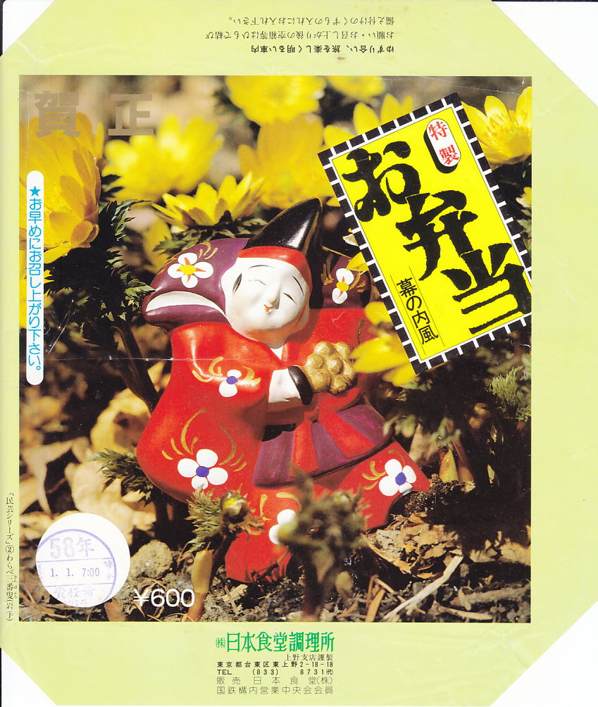 1983(昭和58)年1月1日7時の調製と思われる、昔の上野駅弁の掛紙。「賀正」の文字が左上に記される、正月限定の駅弁掛紙である。写真も目出度いものを使ったのではないかと思ったら、左下に「「民芸シリーズ」2わらべ三番曳(岩手)」とあるので、シリーズものの絵柄か。