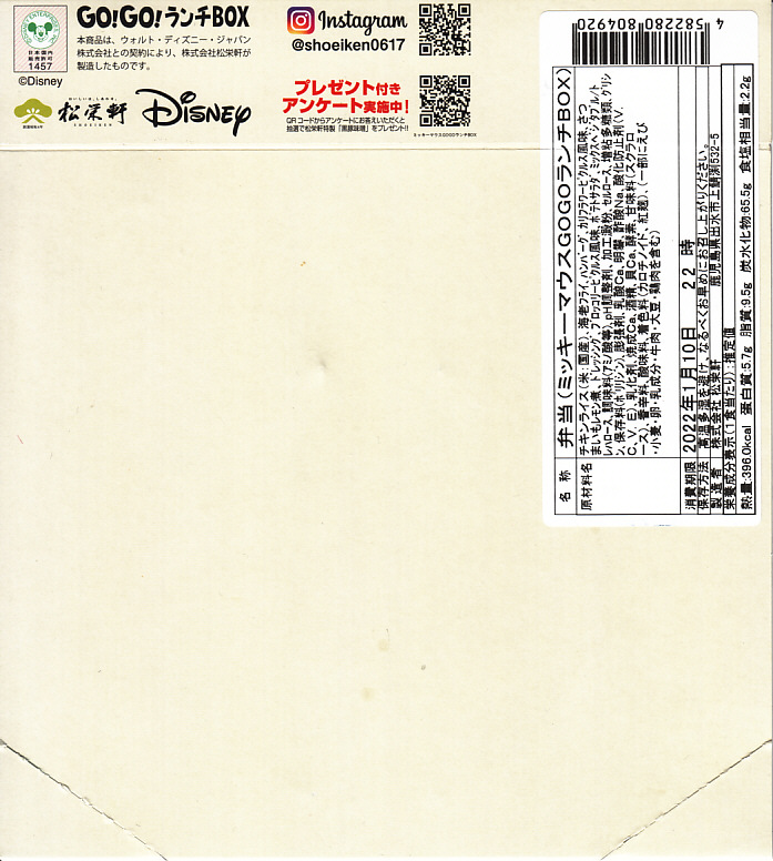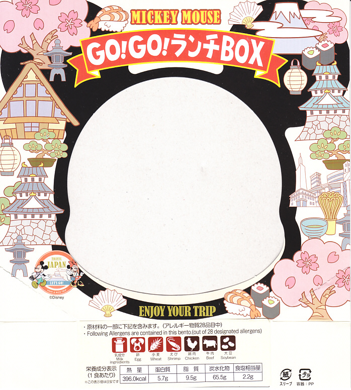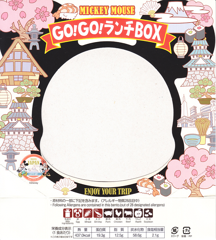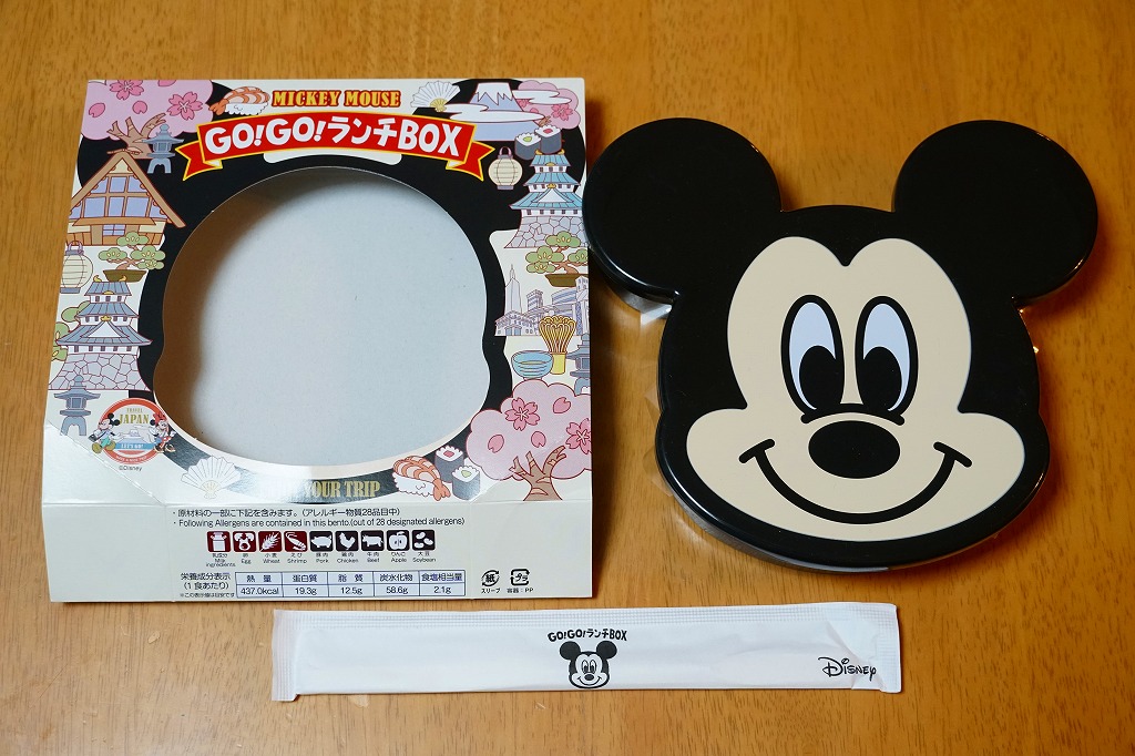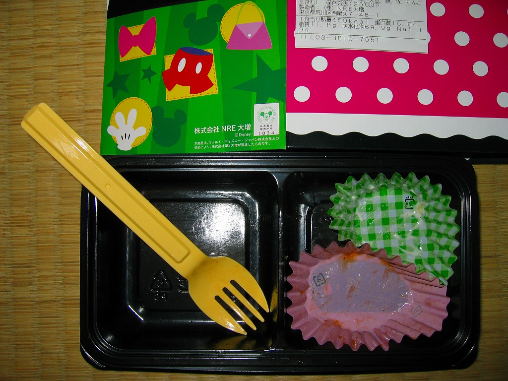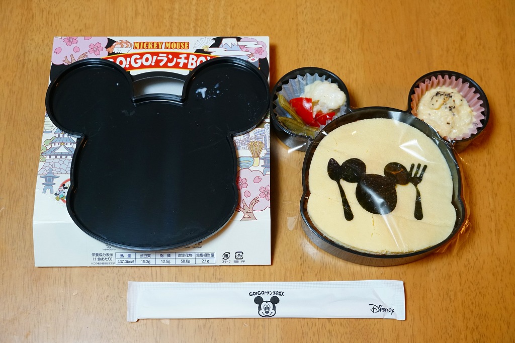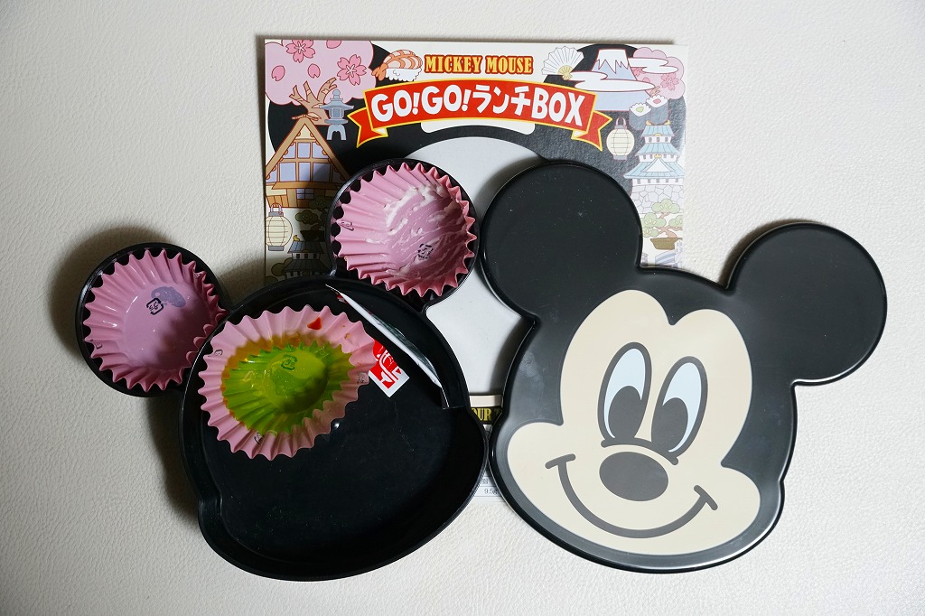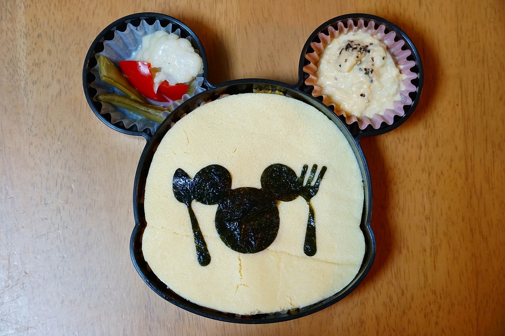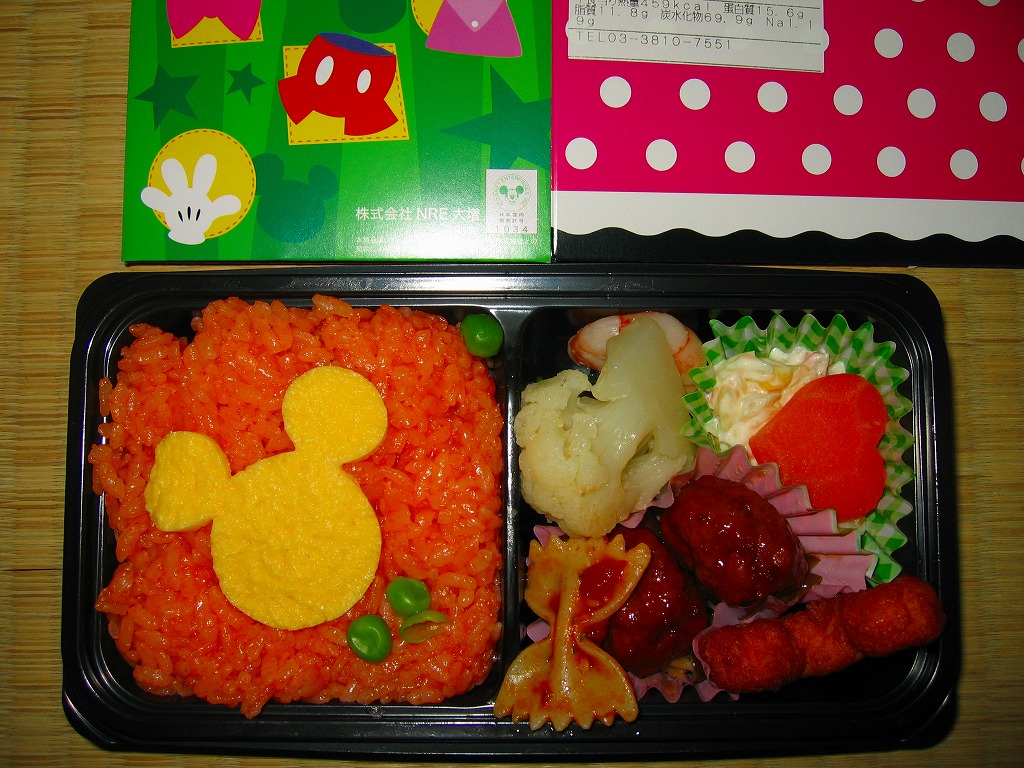 見た目はご覧のとおり。世界中で知られる有名キャラクターを見間違えようがない、ド直球の出現に驚かされる。プラ容器の中身は、チキンライスに海苔を置いて、海老フライとハンバーグとミックスベジタブルとさつまいもレモン煮とケチャップを添え、ピクルスとポテトサラダを張り出すもの。なお、このキャラクターが東京駅弁になることは、下記のとおり初めてではない。