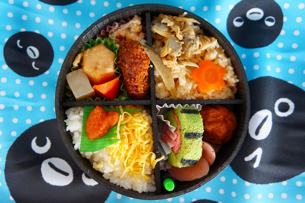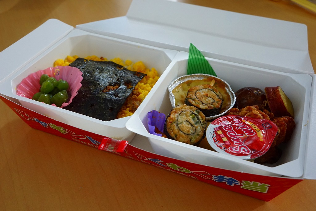 中身は白御飯に鶏と卵のそぼろと、キャラクターを描いた海苔を載せ、うぐいす豆を添えるトレーと、鶏肉海苔巻の串、鶏唐揚、グラタン、りんごゼリー、スパゲティ、さつまいも、玉子焼などを詰めるトレーのセット。外観も中身も楽しくした鶏飯駅弁。東京駅で売るので当然、調製元はチキン弁当のNRE大増かと思ったら、水戸駅の駅弁屋であるしまだフーズで驚いた。水戸駅では売られない模様。期間限定とはされなかったが、8月までの販売か。