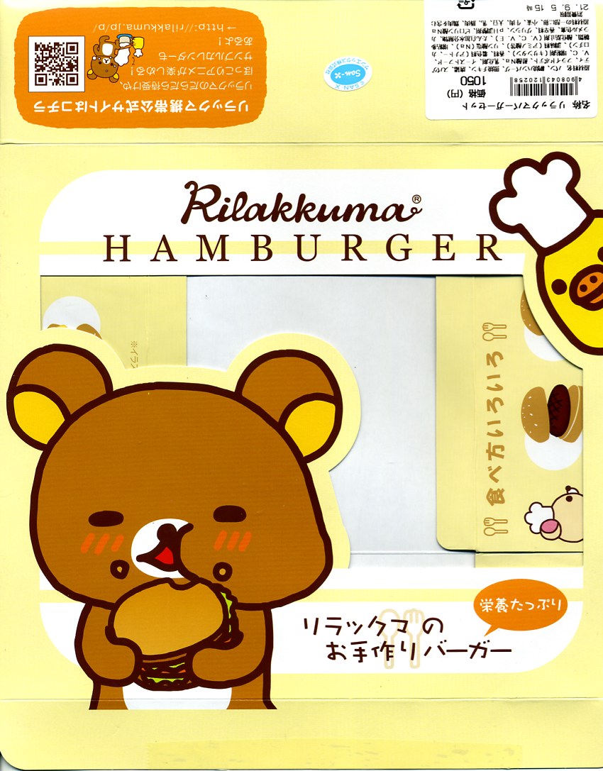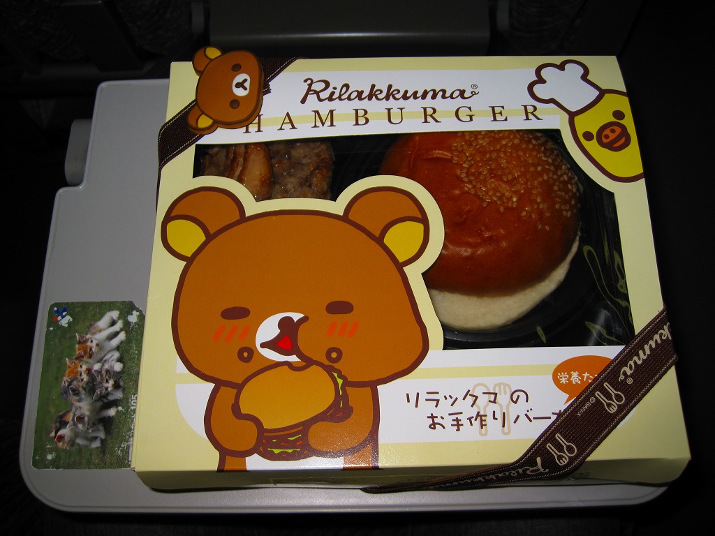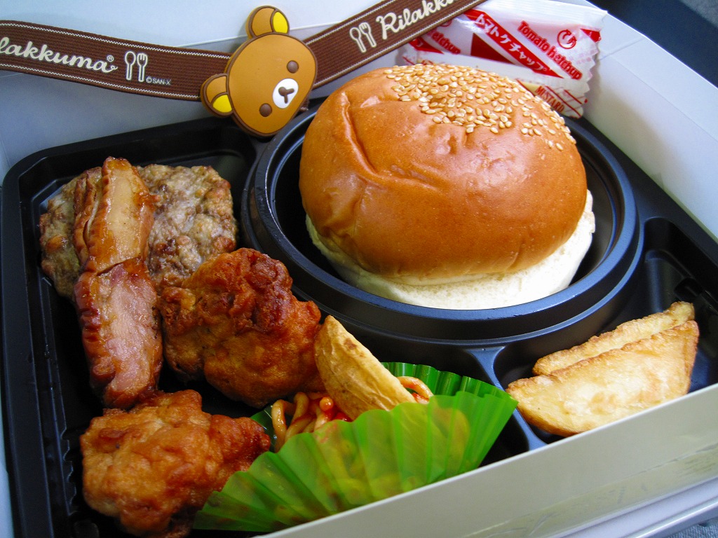 2008(平成20)年11月までに発売したと思われる、駅弁では初めて見たパーツ組み立て式ハンバーガー。販売箇所は東京駅と上野駅の「膳まい」だろうか。2003年に登場したサンエックス株式会社のキャラクター「リラックマ」を大きく描いた、ボール紙製で大きめな正方形の専用容器を使用、これをやはりこのキャラクターの顔で結んだ太いゴムの帯で留める。
