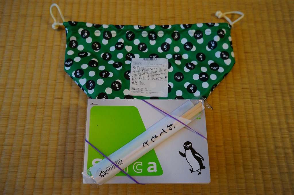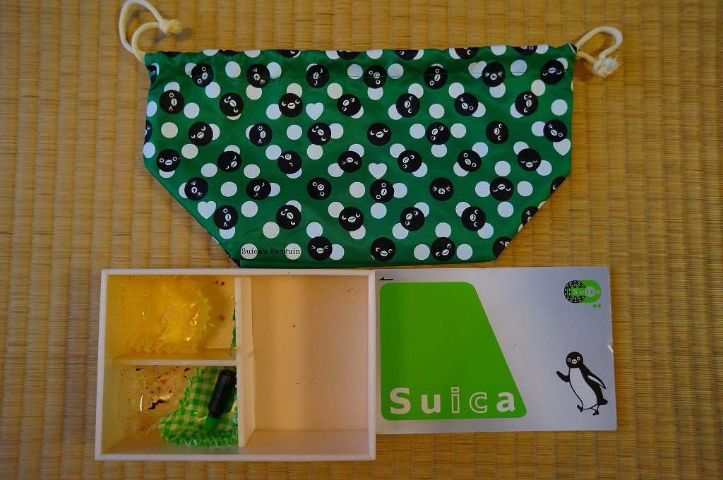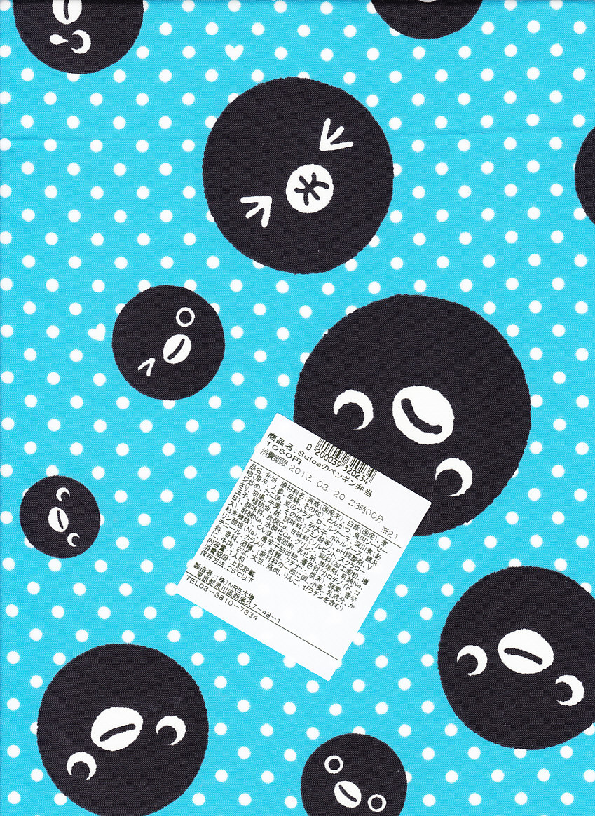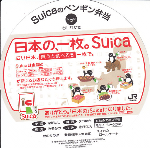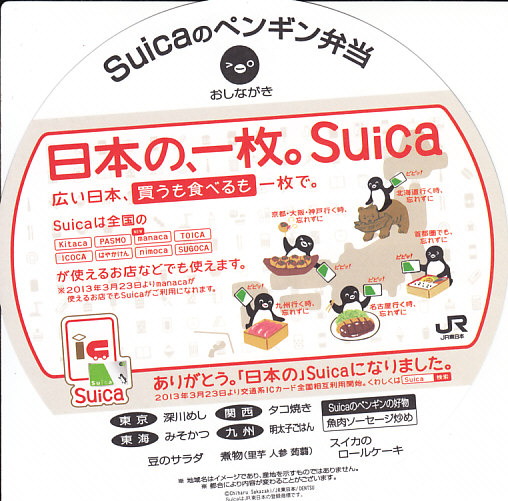 2013(平成25)年3月20日に購入した、東京駅弁の包装。水色、緑色、桃色の3色の展開は広報どおりで、掛紙のペンギンの表情が異なるのはシークレットだった。この年の3月23日に、JR東日本の「Suica」、JR北海道「Kitaca」、関東私鉄の「PASMO」、中京エリアの「manaca」、JR東海の「TOICA」、JR西日本の「ICOCA」、福岡市地下鉄の「はやかけん」、西日本鉄道の「nimoca」、JR九州の「SUGOCA」と関西地区の「PiTaPa」で、ICカード乗車券の相互利用が始まった。PiTaPaを除く9種では電子マネーの相互利用もOK。