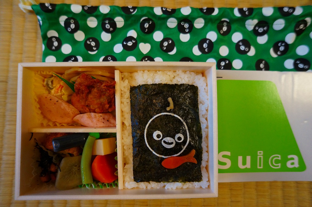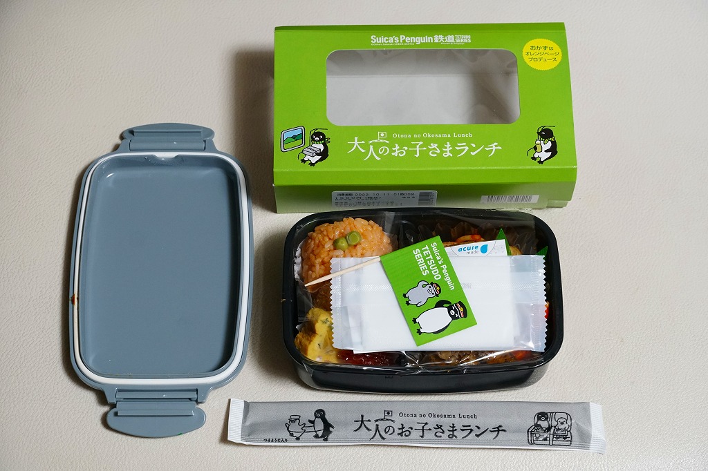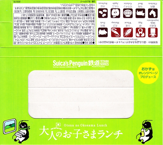 ふたで密封できるプラ製の小さな弁当箱では、JR東日本のICカード乗車券「Suica(スイカ)」のキャラクターであるペンギンが旗で列車に信号を出し、これを緑色のスリーブに収める。中身は御飯の部分にトマト風味ライスおむすび、ライスコロッケ、玉子焼、塩トマト甘納豆。おかずの部分にスパゲティナポリタンとポテトフライ、鶏マスタード焼、ウインナー、海老フライ、チーズポテトサラダ、ハンバーグ。子供向けの容器と洋食弁当の内容に、大人向けの味付けをした感じ。11月中には売り切れか。