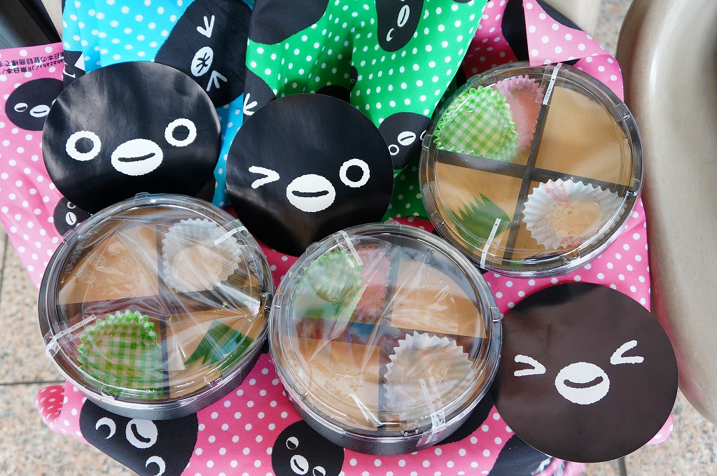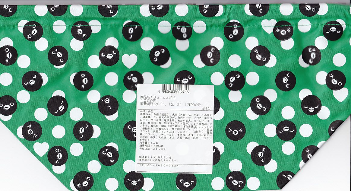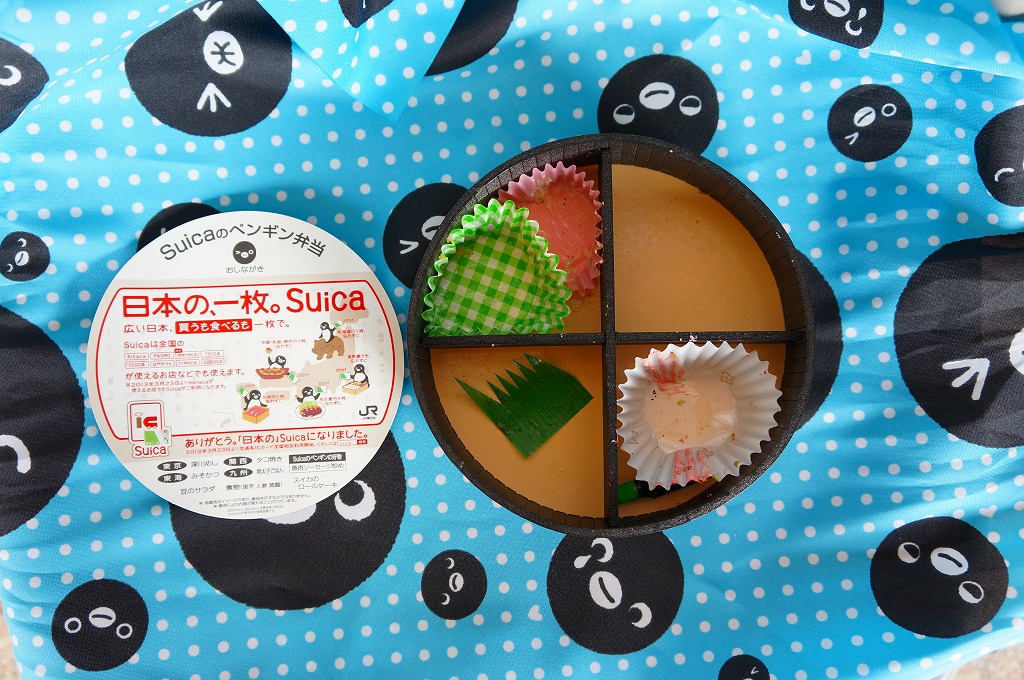 東京駅の駅弁売店「駅弁屋 祭」で2013(平成25)年3月18日から27日まで開催された「交通系ICカード全国相互利用開始記念駅弁大会」で売られた記念弁当。JR東日本のICカード乗車券「Suica」のキャラクターであるペンギンの丸い顔で風呂敷と掛紙と容器を揃えた。