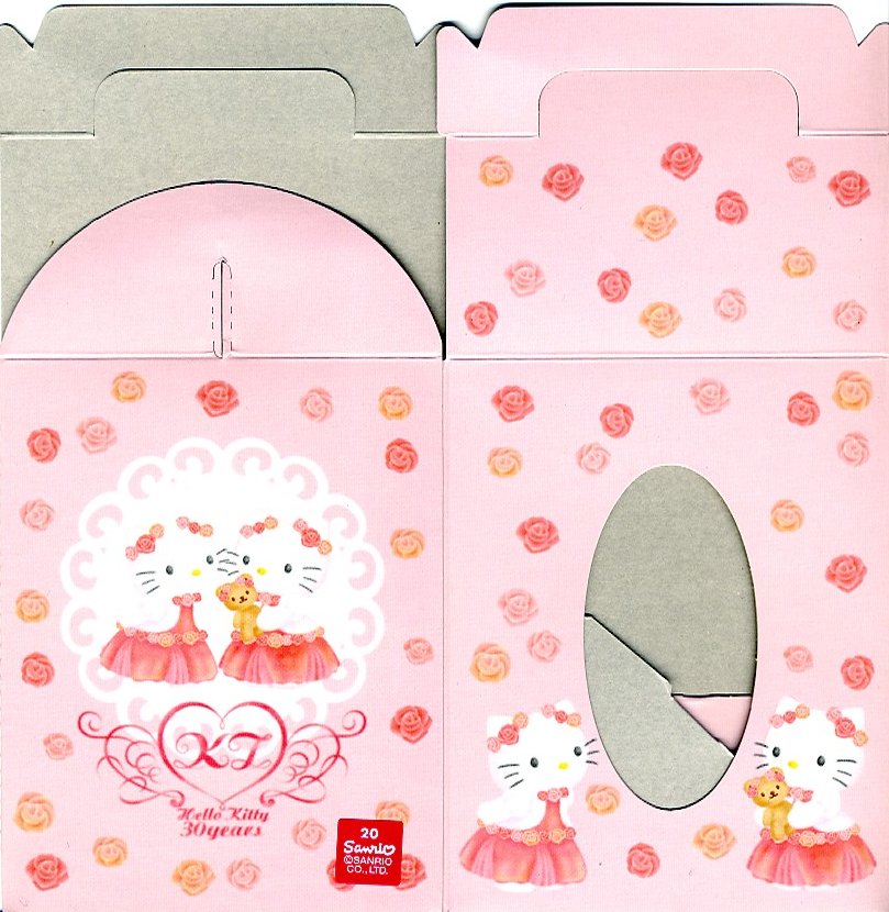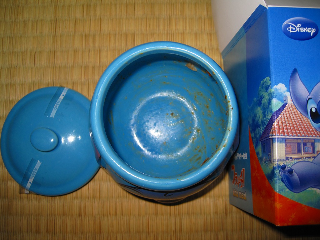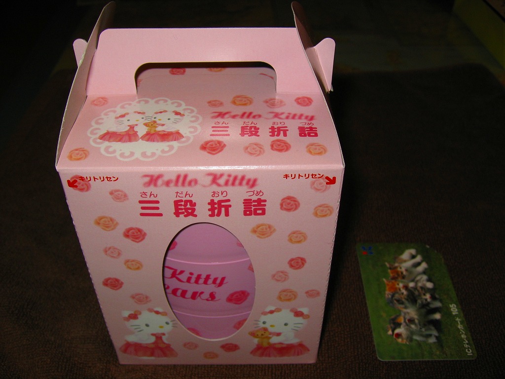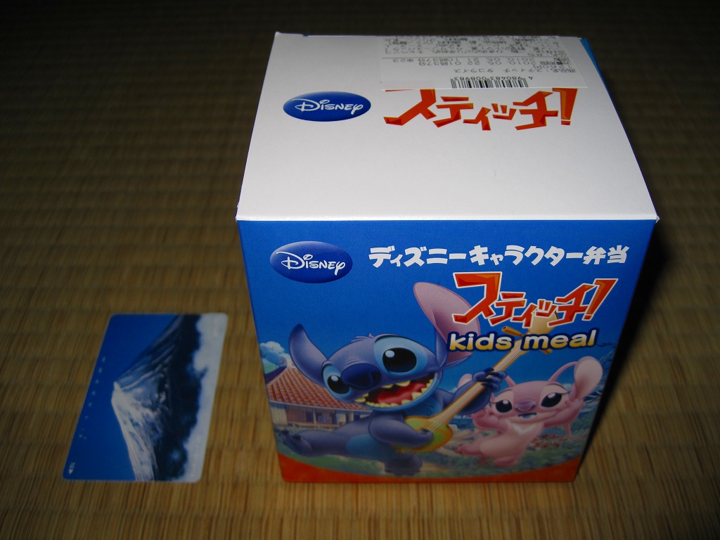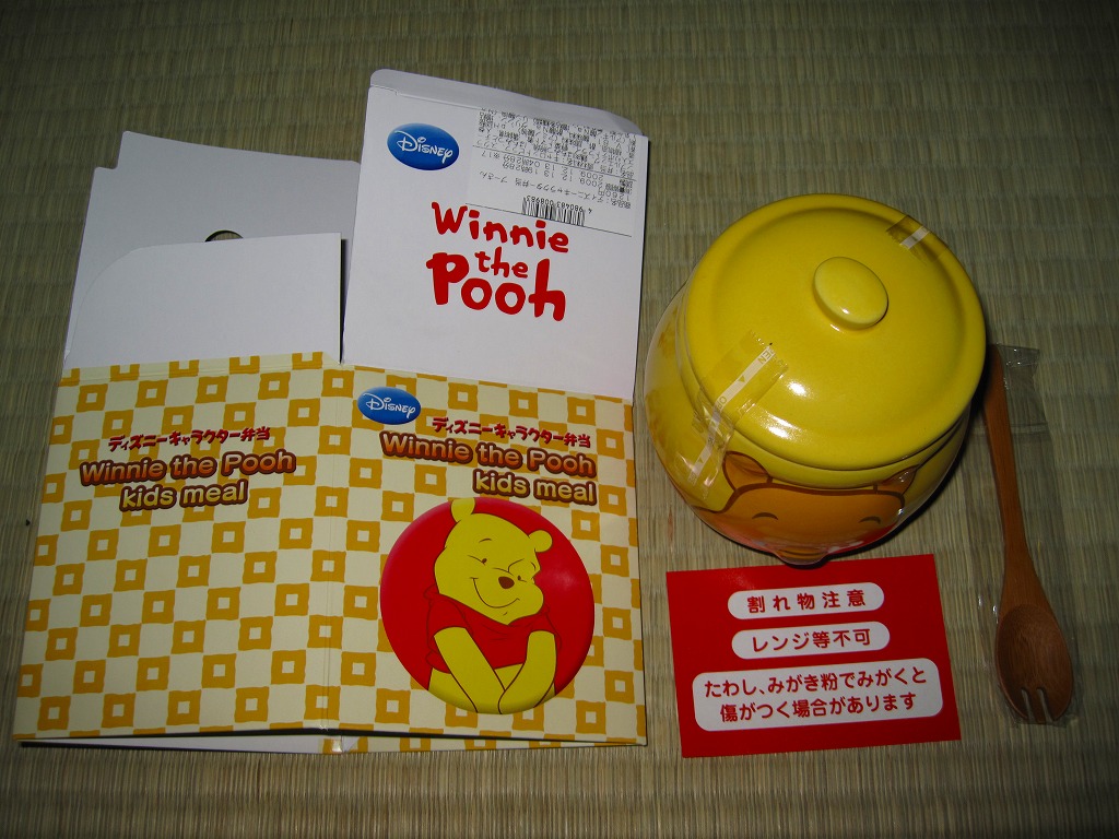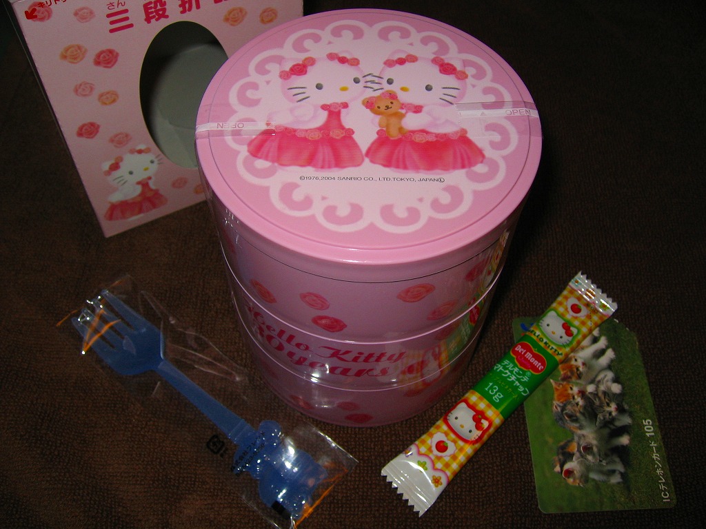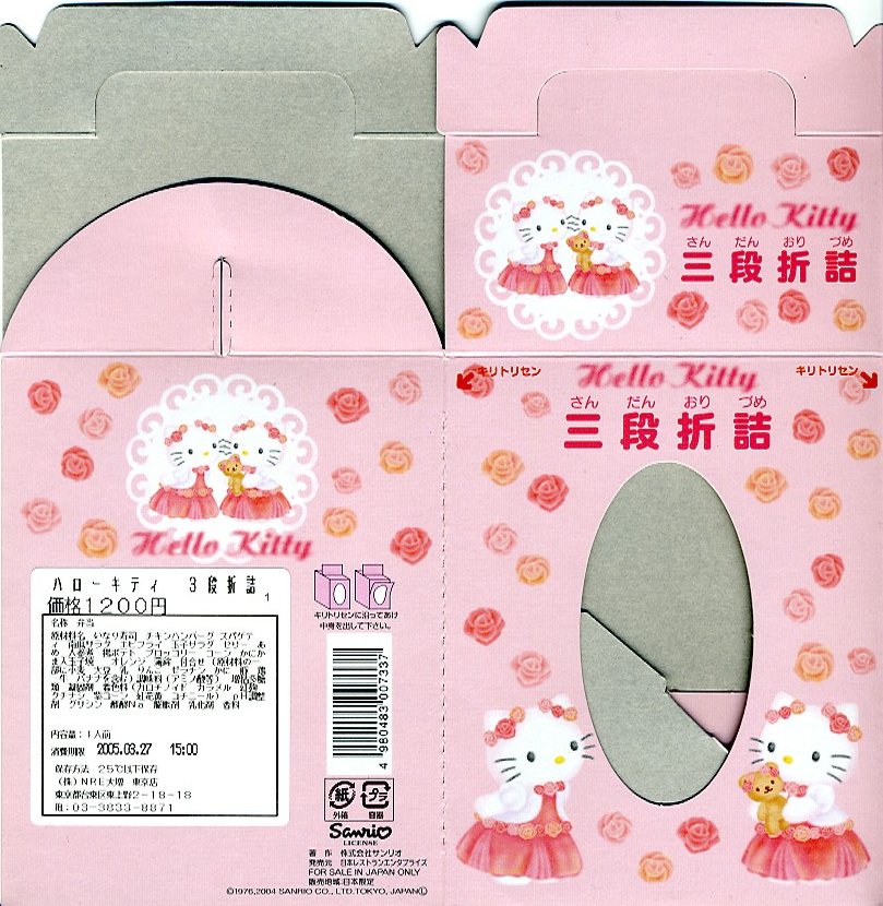 2004(平成16)年7月から12月まで販売された、サンリオのキャラクター「ハローキティ」30周年記念駅弁。キティ柄の円形三段重ねプラ容器を、やはりキティ柄の紙箱に収める。中身は下段がキティ顔のいなりずしに玉子とコーンとブロッコリーとニンジン、中段にエビフライとスパゲティと星形のニンジンやコロッケなど、上段にオレンジと飴とミニゼリーなど。キティ顔のプラ製フォークも付いてくる、中身ではなく容器を買う駅弁。購入時で販売期間は過ぎていたが、なぜか取り扱いがあった。2005年内には終売か。