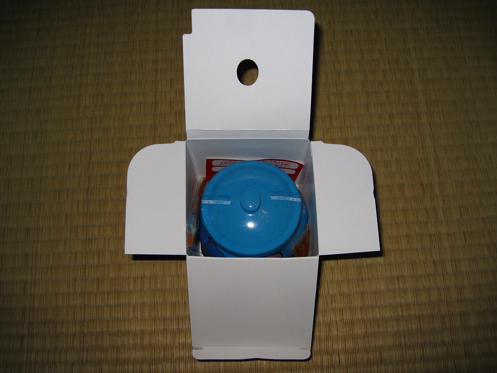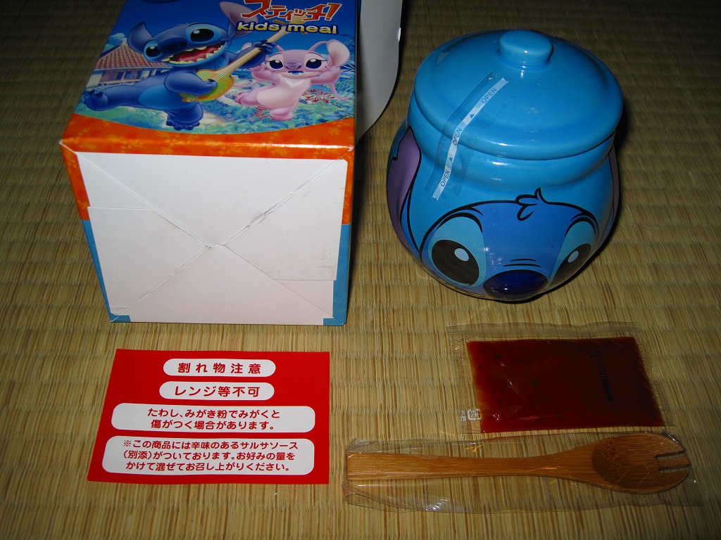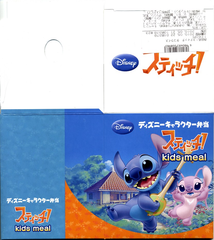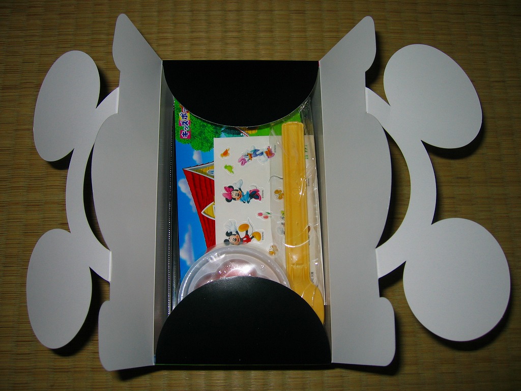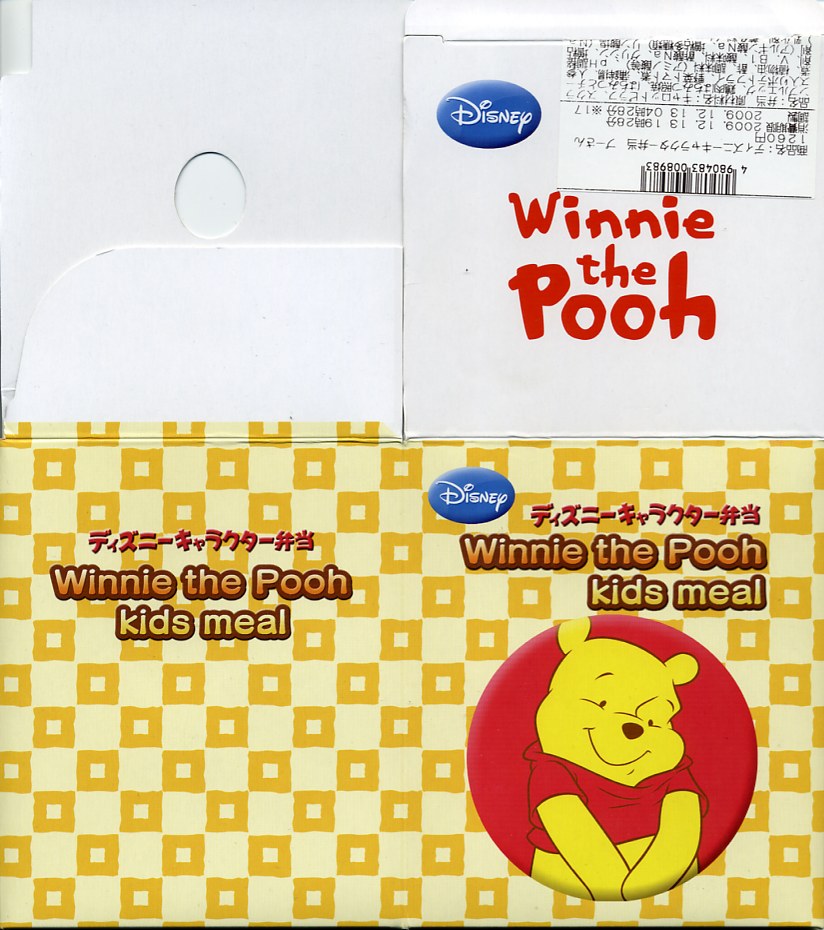 透明なふたが付いた黒いプラ製トレーに収まる中身は、バンズの上下が1組と、ハンバーグ1個、鶏照焼3切れ、鶏唐揚2個、スパゲティとフライドポテト3個、トマトケチャップとマスタード。肉類の分量はけっこうあり、これらを組み合わせてハンバーガーを作ってもよし、すべて挟み込んでスペシャルバーガーをこしらえてもよし、単品で食べてもよし。そんな高カロリーで健康に悪そうな内容がどうであれ、このキャラクターを知らない人はまず買わないであろう、知っている人は買わずにはいられない商品だと思う。ゴムバンドを弁当箱用などに流用してもよし。2009年のうちに終売か。