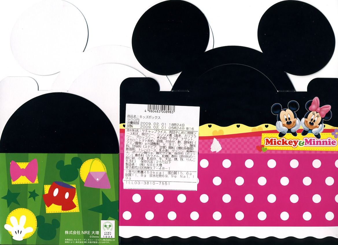 2008(平成20)年12月15日に発売。ネズミの男女のキャラクターを描いたり模したボール紙の容器を使用、その中にはキャラクターのシールとその台紙が入っている。プラ製トレーに収めた中身は、ケチャップライスにミートボール、チキンナゲット、コーンサラダ、ブロッコリーなどで、もものゼリーを別添。見るからにお子様弁当で、キャラクターを買って楽しむ駅弁。通常のNRE駅弁の販売駅と異なり、これは東京駅と新幹線車内販売と鉄道博物館で売られている模様。なお、京葉線舞浜駅前のテーマパークは弁当の持ち込みを禁止している。半年ほどで終売か。