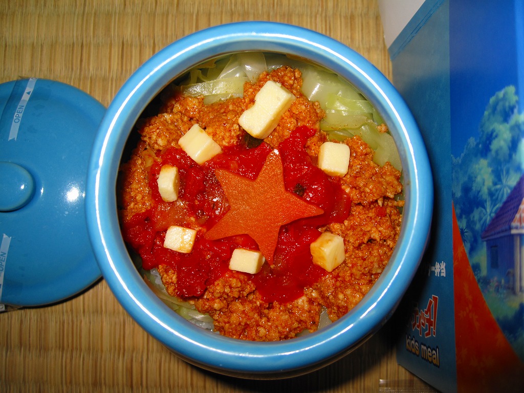 タコライスと一言で語られる中身は、白御飯の上にキャベツ煮を敷いて、挽肉炒めや野菜のトマト煮をかけて、チーズとニンジンを置くもの。今回のキャラクターは2002年に映画で登場したエイリアンで、2009年10月からは日本のテレビアニメにもなったものだそうな。年内に終売か。
