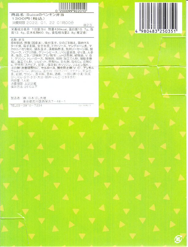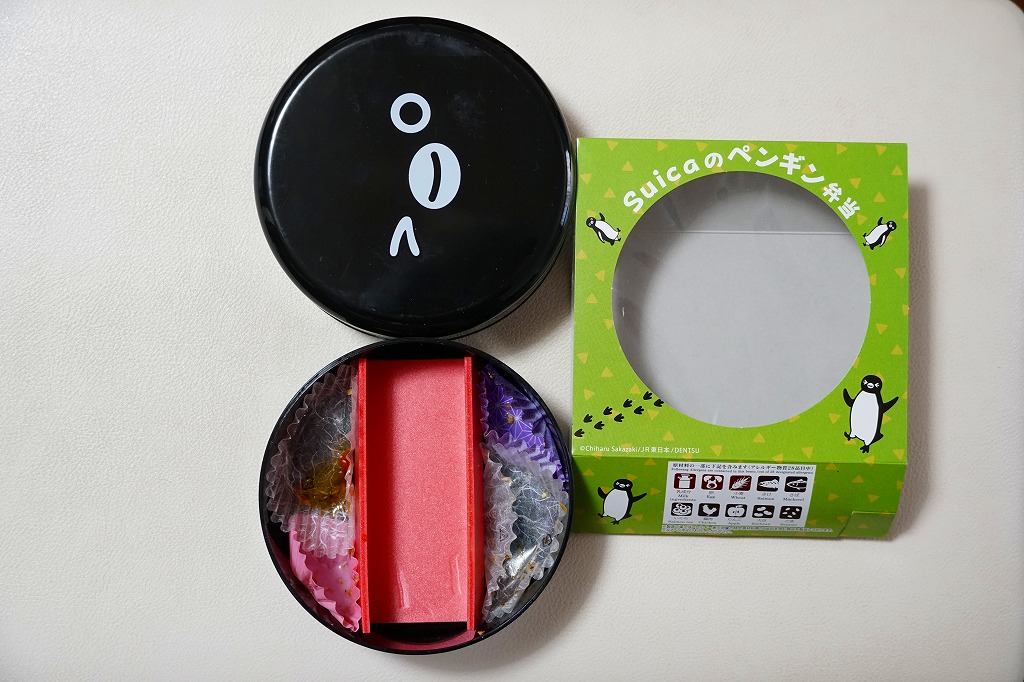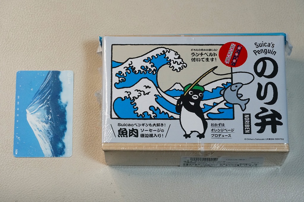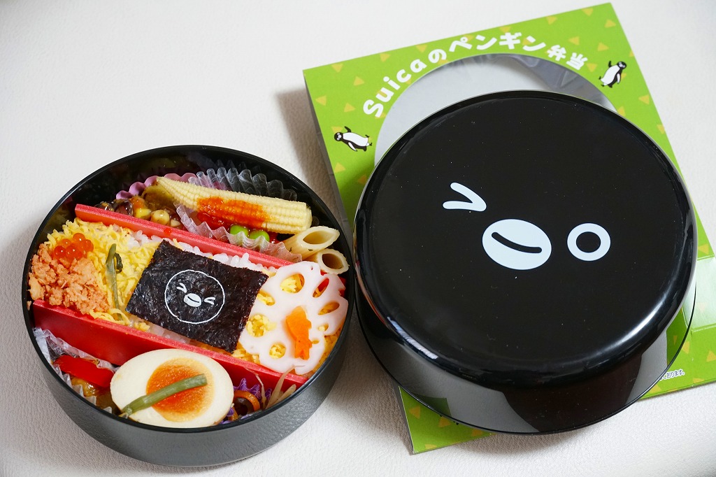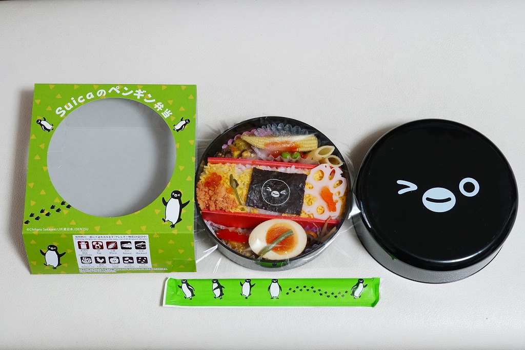 商品名は「Suicaのペンギン弁当」とも。2022(令和4)年10月1日から、東京、上野、新宿、大宮の各駅で、20,000個を販売。鉄道開業150年にちなんだ商品群のひとつとして、オレンジページがプロデュース、日本ばし大増が調製し、JR東日本クロスステーションが販売した、JR東日本の100%子会社のタッグ。同月からのJR東日本の駅弁キャンペーン「駅弁味の陣2022」にもエントリーした。