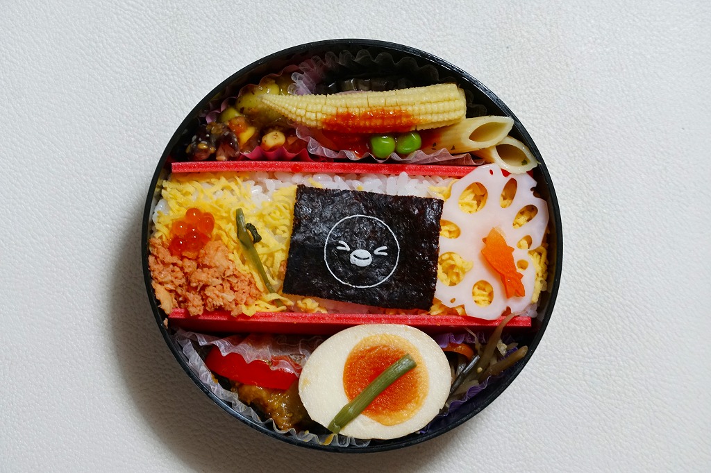 黒く丸いプラ容器に白く目と鼻と口を記し、黄緑色のスリーブに収める。中身は3区画に仕切り、真ん中で酢飯を錦糸卵、イクラ、鮭フレーク、れんこん、ペンギン型にんじん、Suicaペンギンの海苔で覆い、その両脇を煮玉子、鶏マスタード焼、マカロニ、ヤングコーン、なす素揚、豆のごま和えなどで固める。今回のSuica弁当は1種類の販売に見えて、海苔の顔が両目ぱっちり、右目(左側)ウインク、うれし涙、この両目つぶりの4種類あるようで、これはとても集められない。3月15日まで販売。