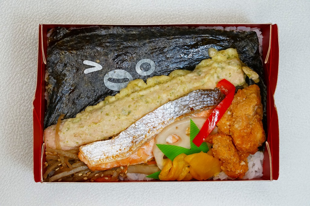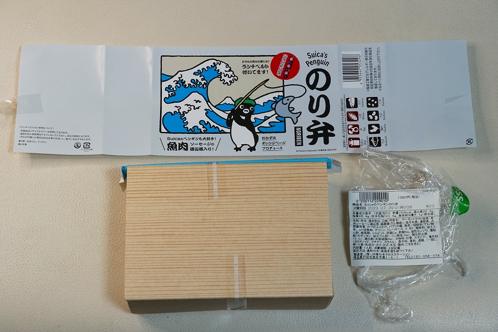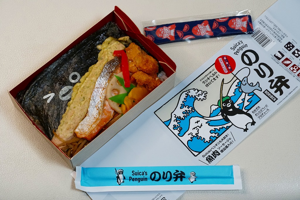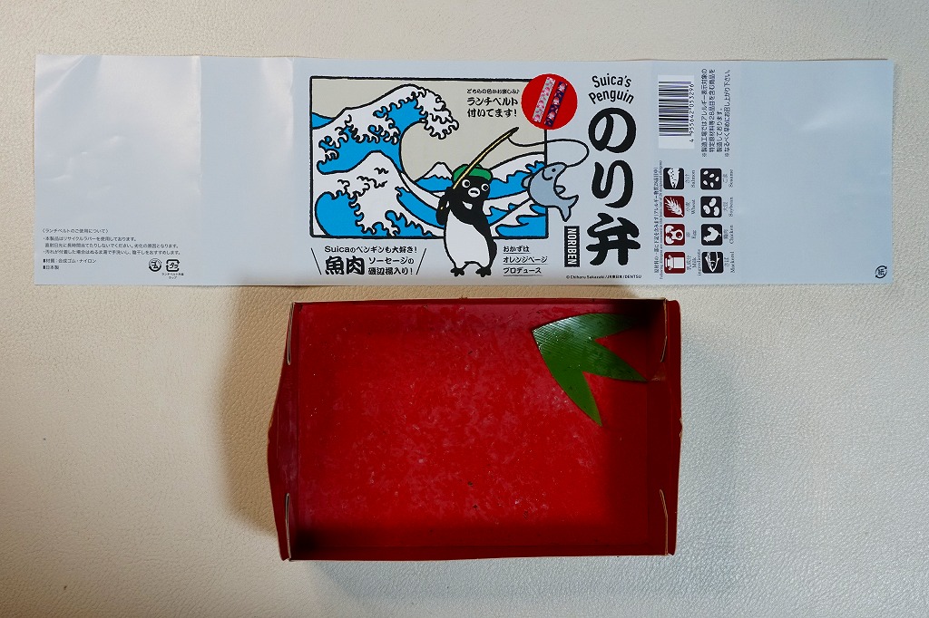今回は使い捨ての紙容器に、Suicaペンギンが絵柄の表面にも、おしながきの裏面にもいる掛紙を巻く。この紙容器に白飯を詰め、Suicaペンギンの表情を印刷した海苔とかつおふりかけで覆い、サーモントラウト塩焼、魚肉ソーセージ磯辺揚、鶏唐揚、パプリカ揚、きんぴらごぼう、れんこん、だいこんを載せる。東京で売られる海苔弁としては標準的な、千数百円の価格に抑えられたキャラクター弁当。ジャガード織のゴムタイプのランチベルトの青か緑のいずれかを添付するので、他の海苔弁よりお徳か。あくまでも東京駅で買える海苔弁の値段として。
