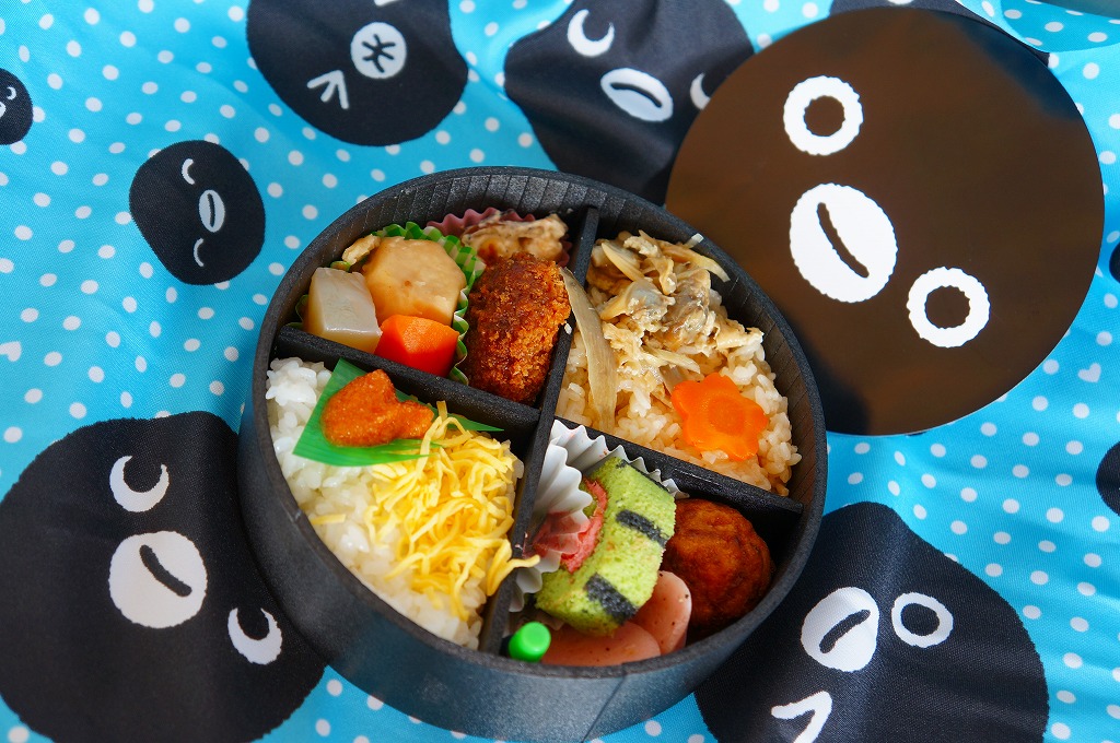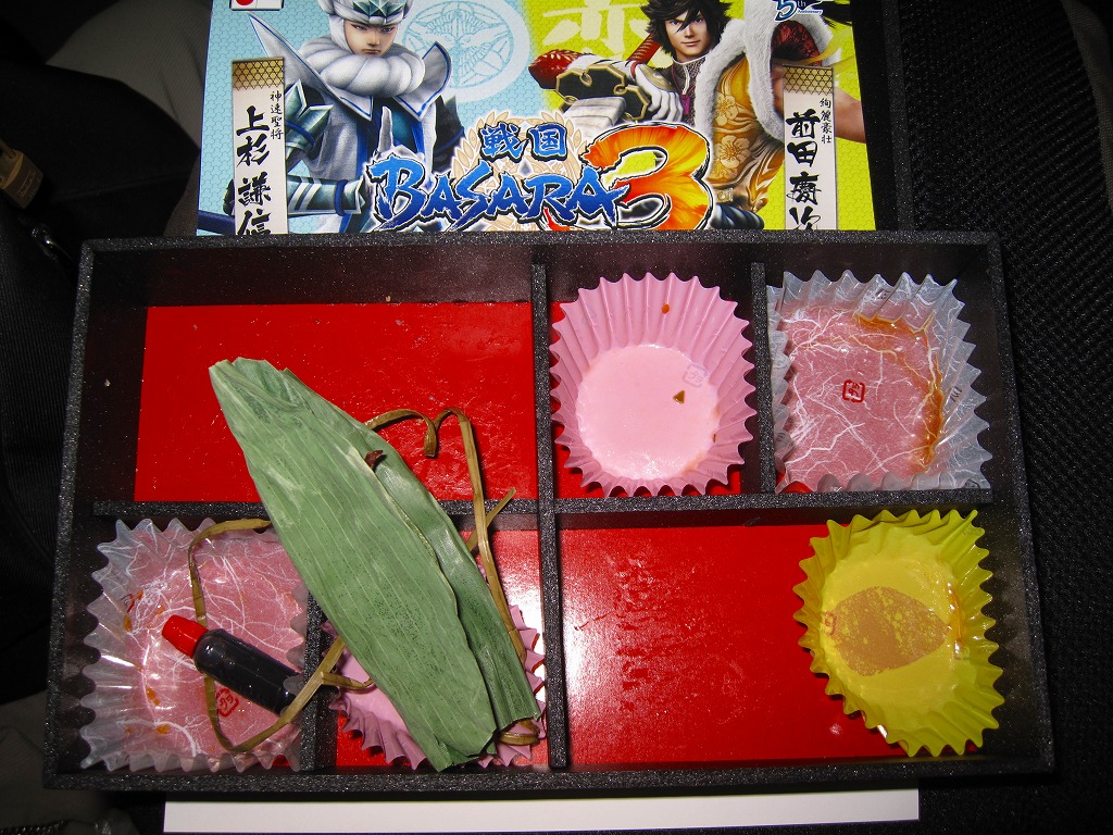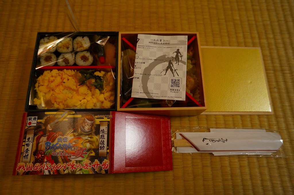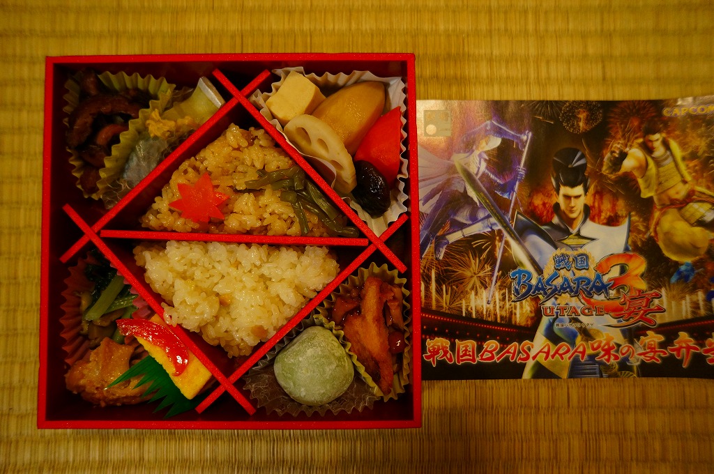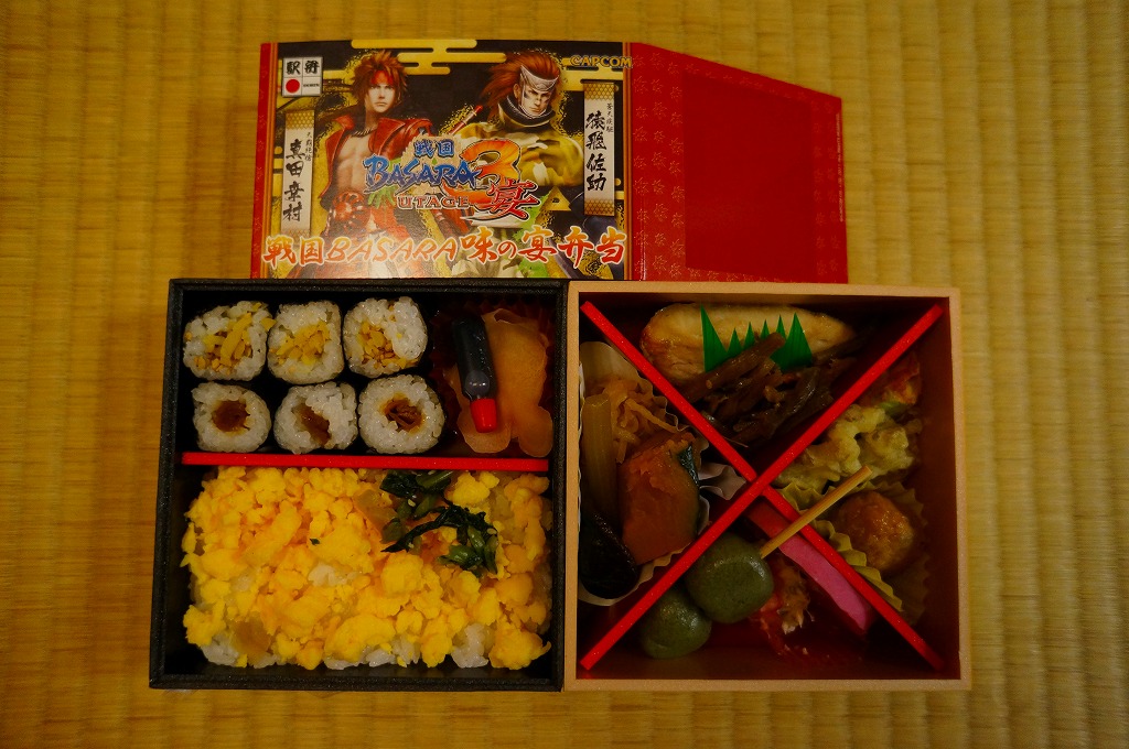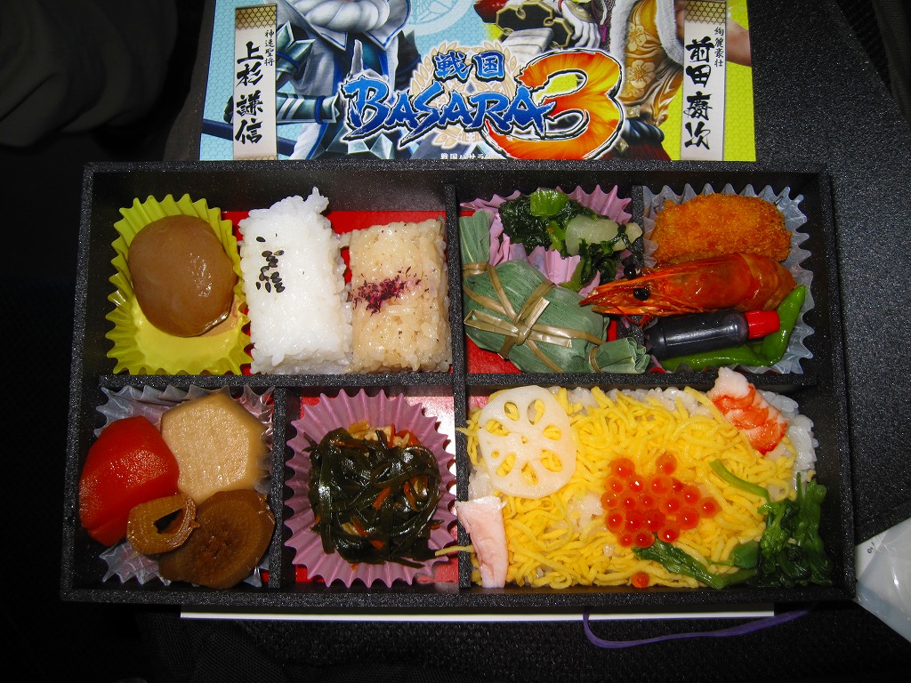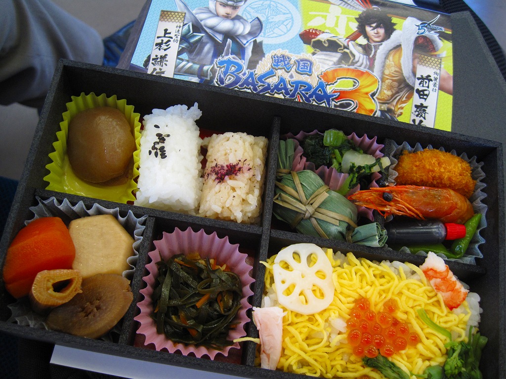 真っ黒な長方形の容器に、そのゲームソフトにおける上杉謙信と前田慶次の姿を印刷した掛紙を巻く。中身はちらし寿司、白飯と茶飯の俵飯、有頭海老、ホタテ風味フライ、ししとう、おみ漬、笹団子、玉こんにゃく、サトイモやニンジンなどの煮物、切昆布煮など。上杉謙信の新潟県と前田慶次の山形県をイメージしたのだそうな。こちらはゲームにも戦国史にもうといので、食べ合わせとしては脈絡がないとか、朝食にはちょっと重いかなという感想。