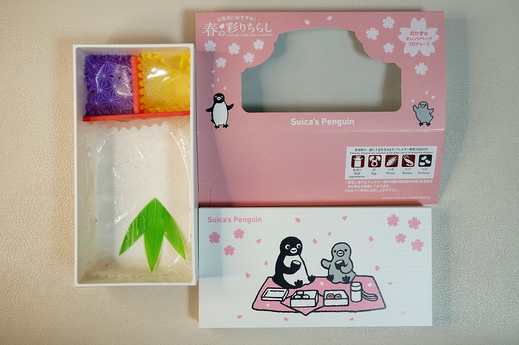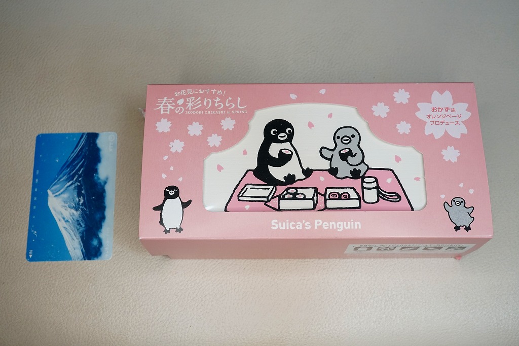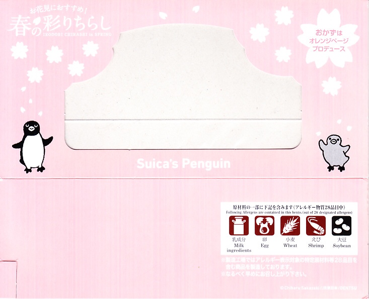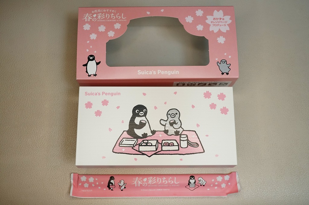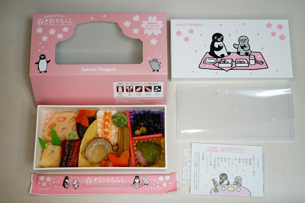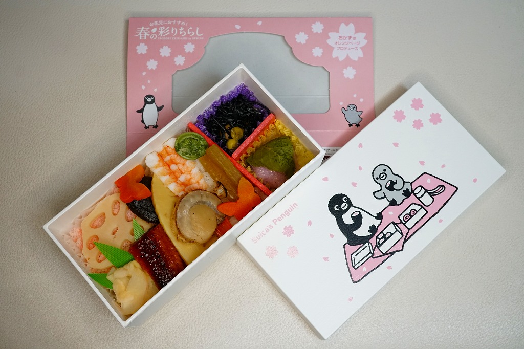 2023(令和5)年3月16日に、東京、上野、新宿、大宮の各駅と鉄道博物館で発売、1万個を販売。2022年10月の「大人のお子さまランチ」に続く、オレンジページプロデュースの駅弁第2弾なのだそうな。第2弾といわず、過去にもいろいろあった気がするけれど。石川県の山中塗の漆器風の弁当箱とする、真っ白で角張った容器には、JR東日本のICカード乗車券「Suica」のキャラクターであるペンギンと、そうでない子ペンギンのような何かが弁当とレジャーシートを広げてピクニック。中身は酢飯をウナギ、ホタテ、エビ、タケノコ、フキなどで覆う「彩りちらし寿司」と、ひじき煮と桜餅。東京の高級折詰もびっくりの高価格も、キャラクター駅弁としてかわいらしいと評判だったようだ。5月までの販売か。