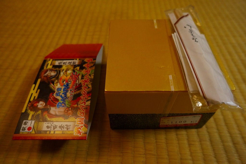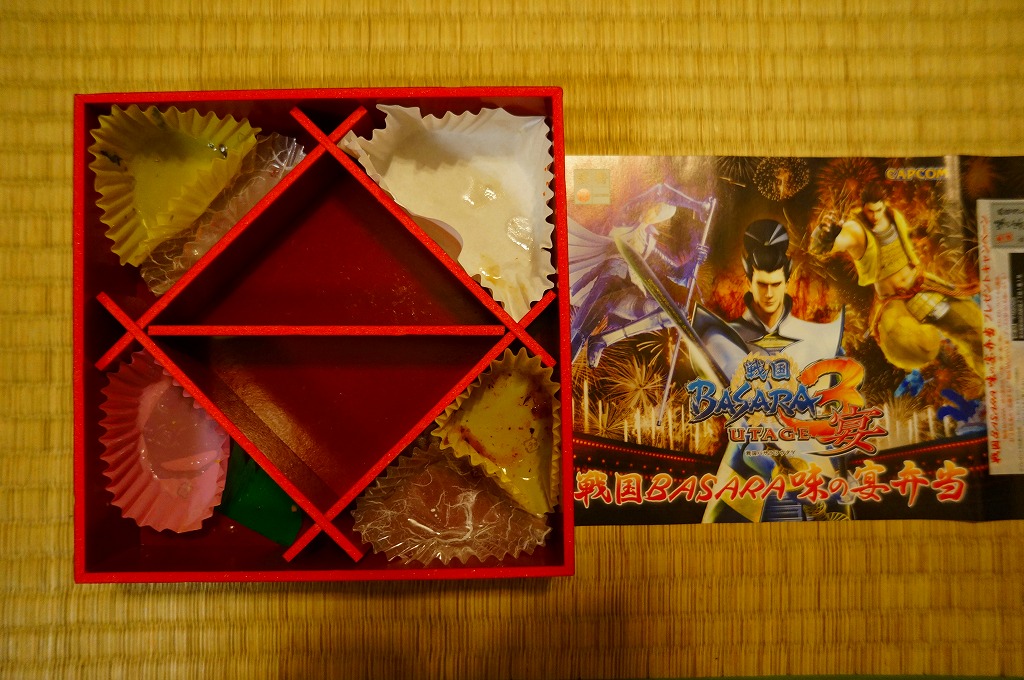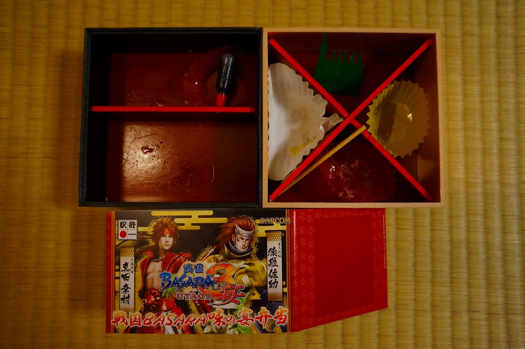 今回の駅弁大会では、前月発売の戦国BASARA弁当が早くも復刻販売、しかも週替わりの3種類すべてが雁首を揃えるという、3週続けて買ったコレクターを嘲笑う仕打ちをしてくれていた。