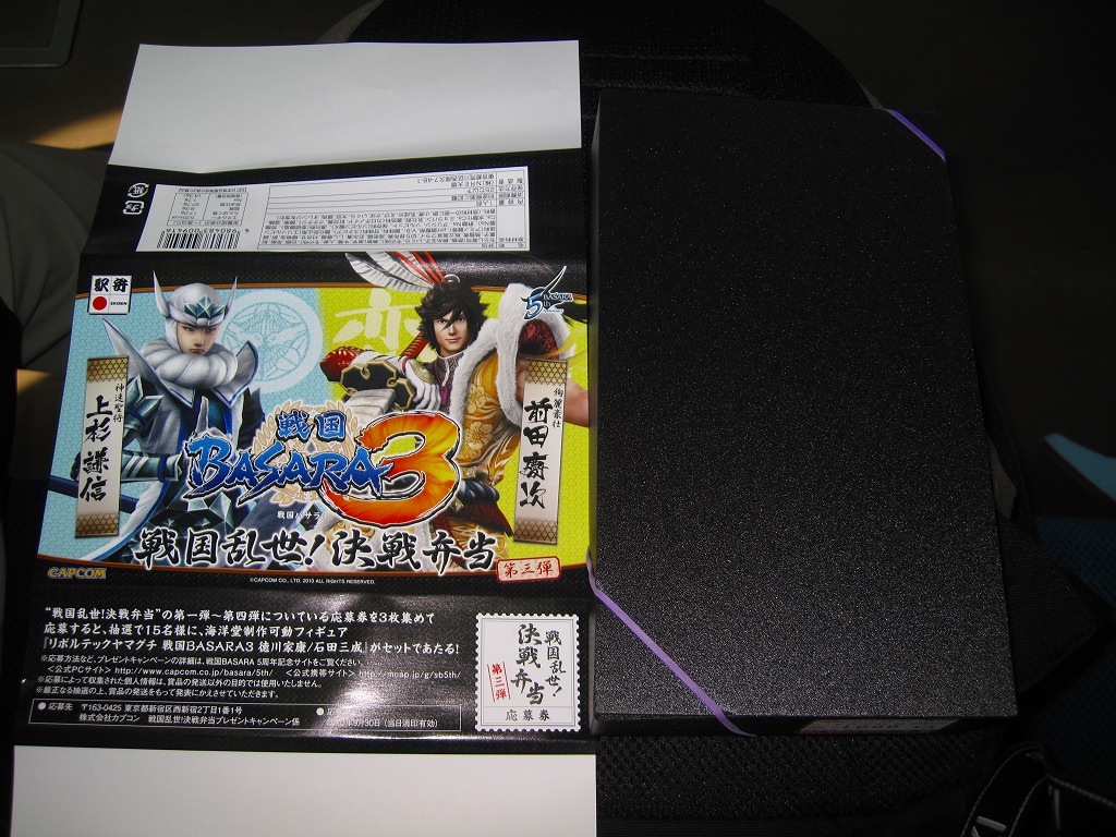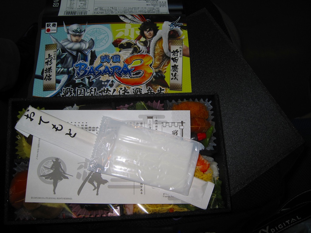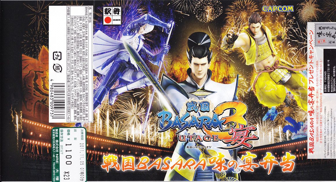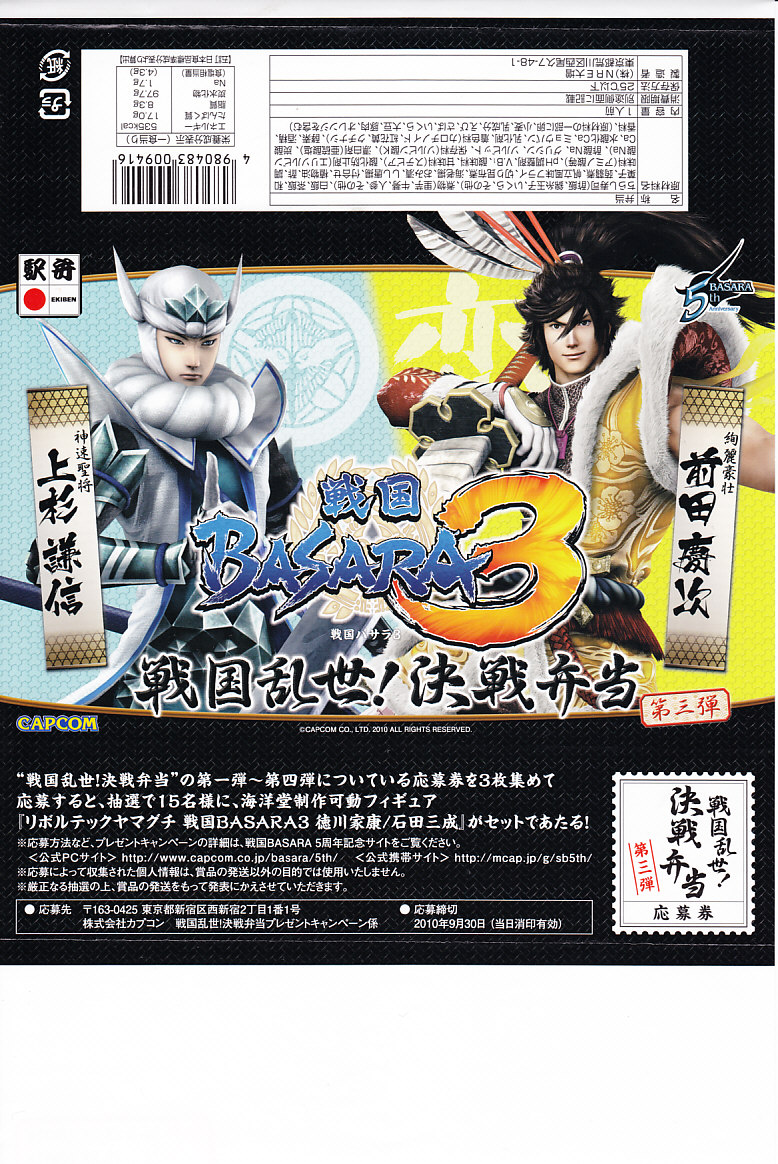 カプコンのWii及びプレイステーション3向けアクションゲーム「戦国BASARA3」の発売と同シリーズの5周年を記念して、2010(平成22)年8月16日から9月12日まで週替わりで各1,059個ずつが東京、上野、新宿、大宮の各駅で販売されたタイアップ駅弁。