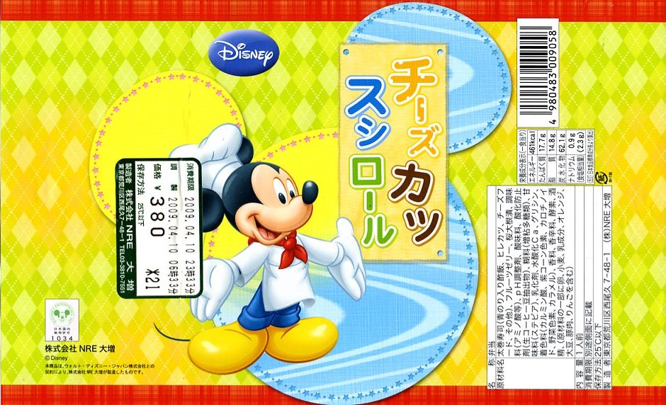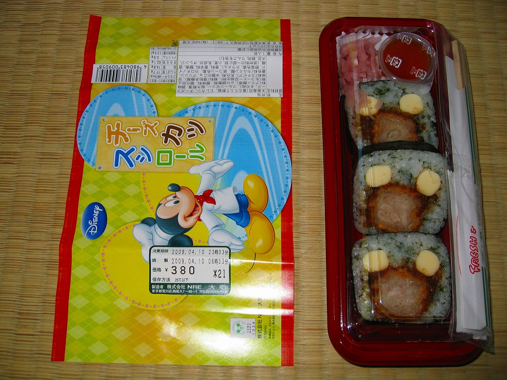 2009(平成21)年4月に発売か。平たく言えば3切れしか入っていない太巻寿司であるが、酢飯に青のりを混入し、カツ1本にチーズ2本を巻くことで掛紙に描かれるキャラクターを模し、カップ入りゼリーと紅生姜を添えてプラ製の惣菜容器に詰めて、掛紙で巻いているもの。見た目も味もとっても楽しい感じ。該当のテーマパークへの乗換駅で売られることで、駅弁への注目をより集める役回りを演じてくれる。年内に終売か。