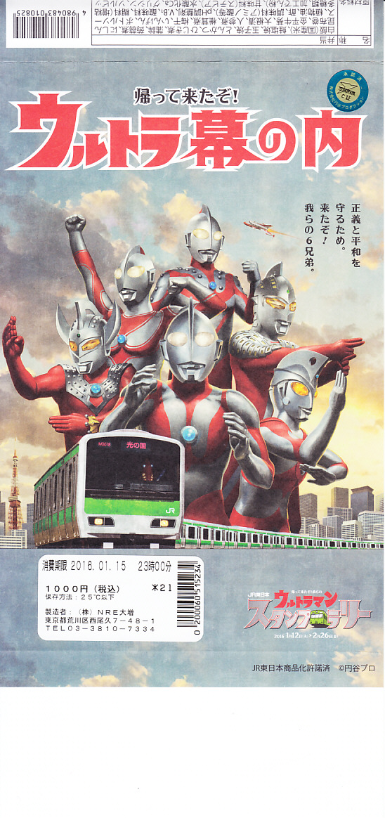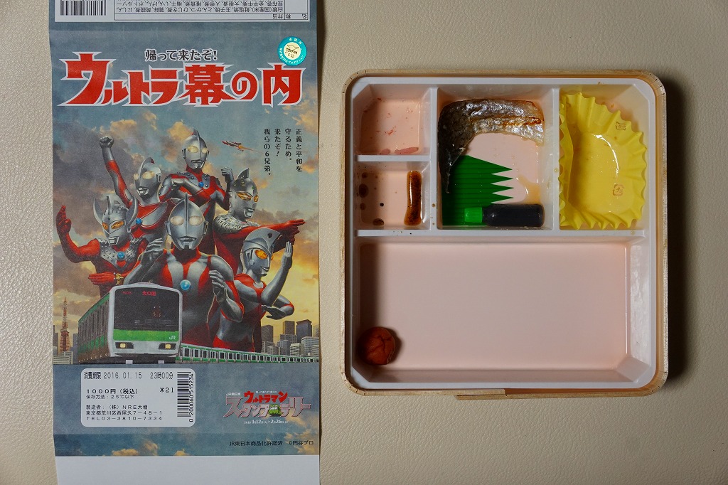 JR東日本のイベント「ウルトラマンスタンプラリー」の実施に合わせて、その実施期間である2016(平成28)年1月12日から2月26日までに、東京、新宿、品川、上野の各駅で1.5万個を販売。中身は日の丸御飯に焼鮭、かまぼこ、玉子焼と、昆布巻、シイタケやインゲンなどの煮物、とんかつ、ひじき煮、きんぴらごぼう、大根桜漬など。