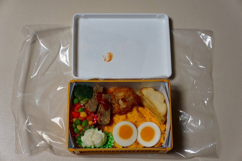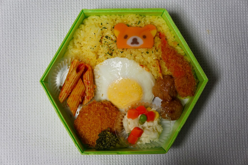 中身はケチャップライスにハンバーグ、鶏唐揚、ポテトフライ、卵とじ、ゆで卵スライス風、ブロッコリー、ポテトサラダ、ミックスベジタブルを載せたもの。これもキャラクター仕様か、見た目の半分をタマゴが占め、そのために食べた感じはガッチリ冷凍食品というものでもなし。2018年までの販売か。