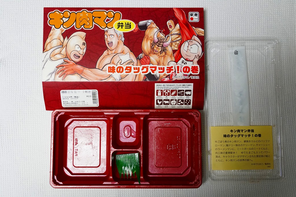 中身は牛丼と肉丼とゆで卵と付合せ。キン肉マンを金粉を載せた牛ごぼう煮、バッファローマンを網焼きカルビ、テリーマンを鶏照焼(とりてりやき)、ミートくんをミートボールで表現。加えてラーメンマンをチャーシューやナルト、作者のゆでたまごをゆで卵で表現したようだ。黄色いしおりに中身の理由を書いて分かりやすいイベント商品で、そうでなくても強力な肉駅弁。次の巻は出るのだろうか。