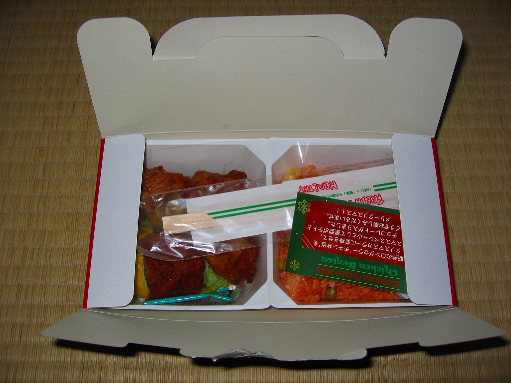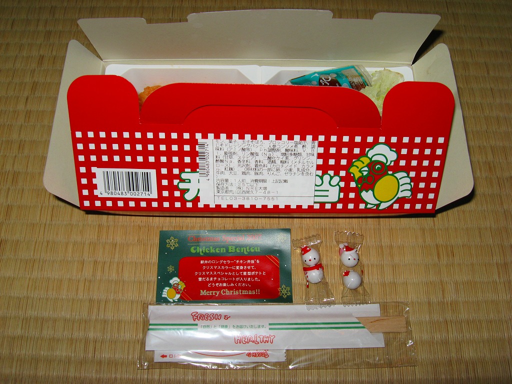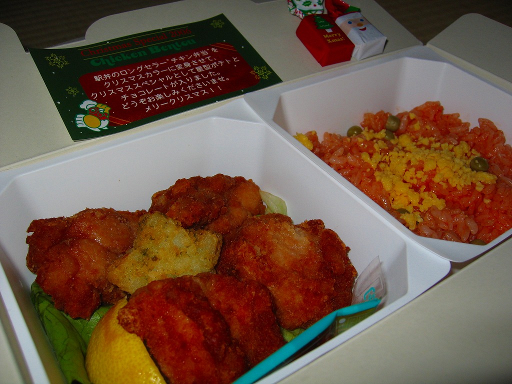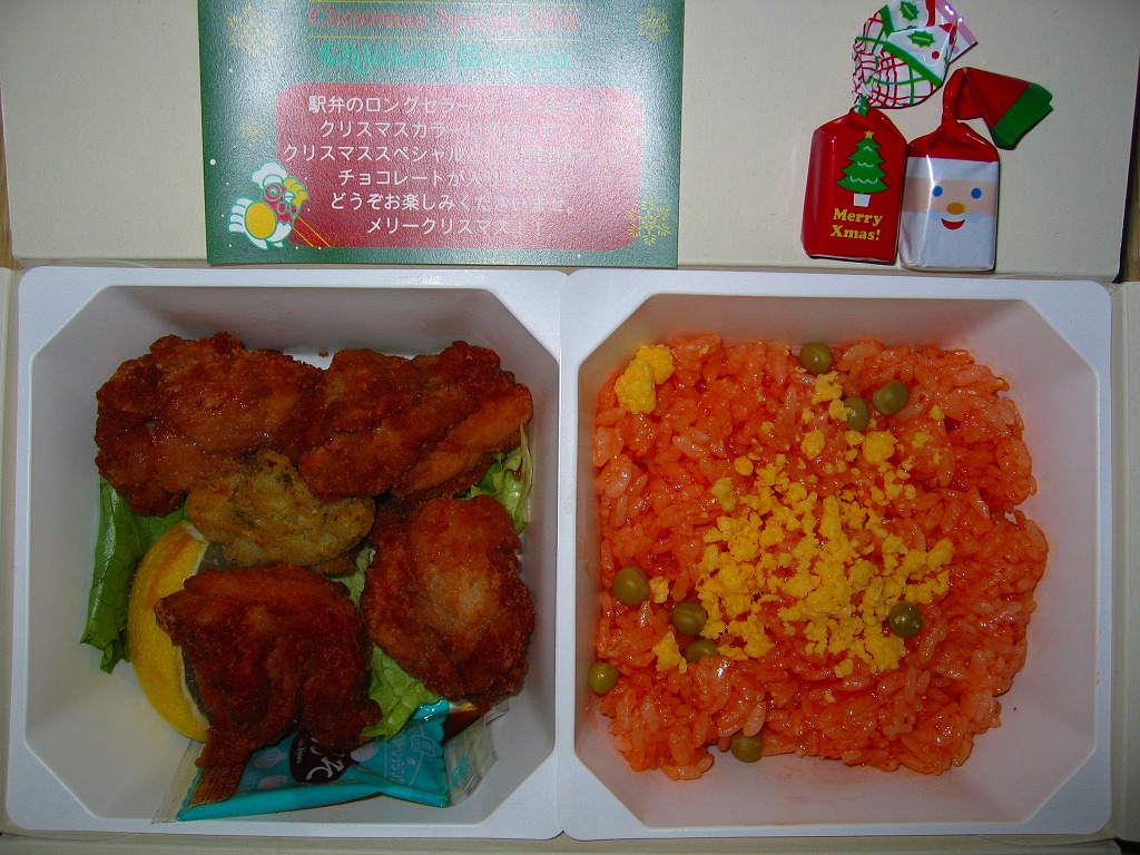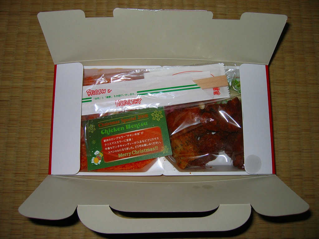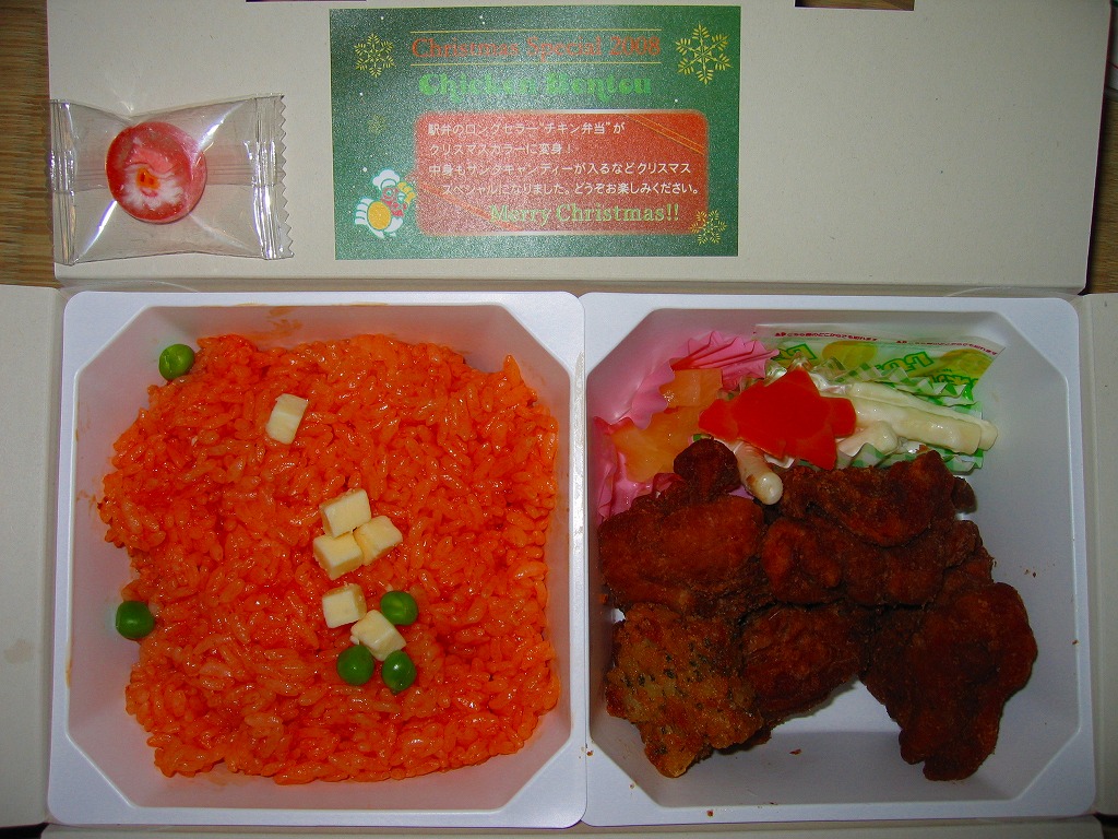 チキン弁当クリスマスバージョンの2010(平成22)年版で、今回は10日から25日までの販売。買いそびれた2009年版では、チキンライスの上に振るチーズがクリスマスツリー型の玉子焼に変わり、今回はサンタクロース顔の金太郎飴がパチンコ玉の大きさのチョコレート2個に変わり、パッケージの背景がチェック柄から雪空?に変わり、クリスマスカードの添付がなくなった。