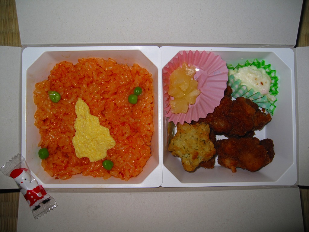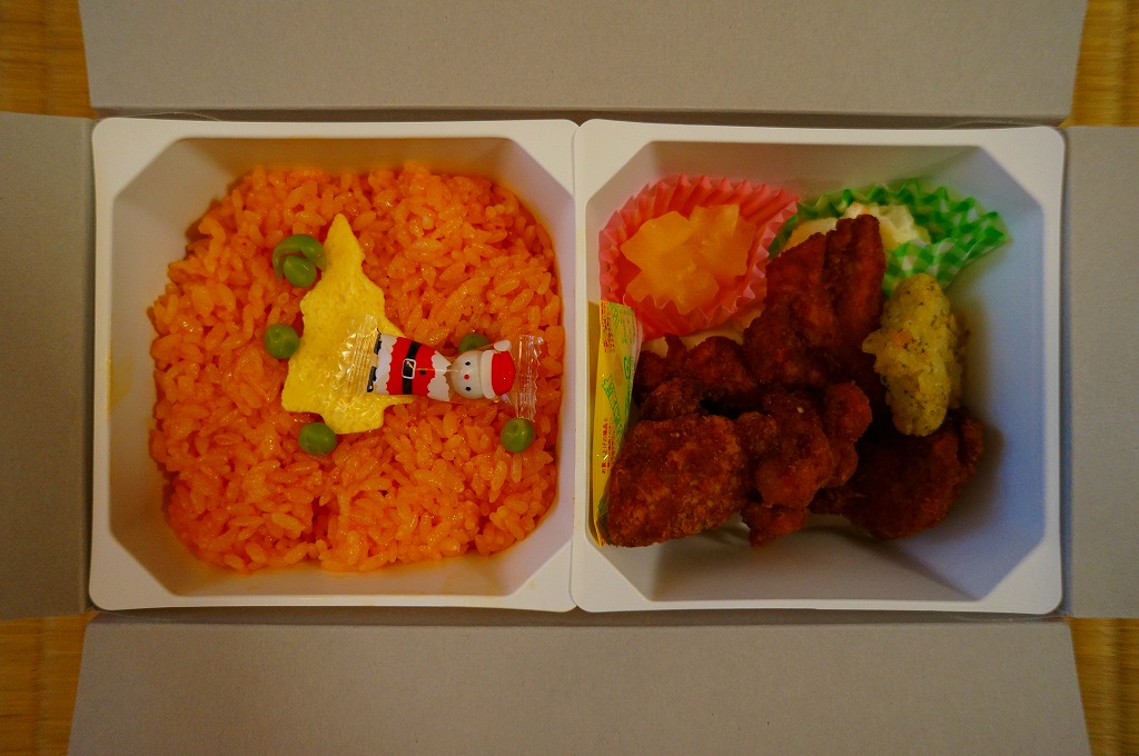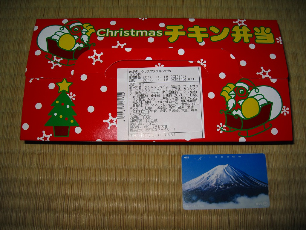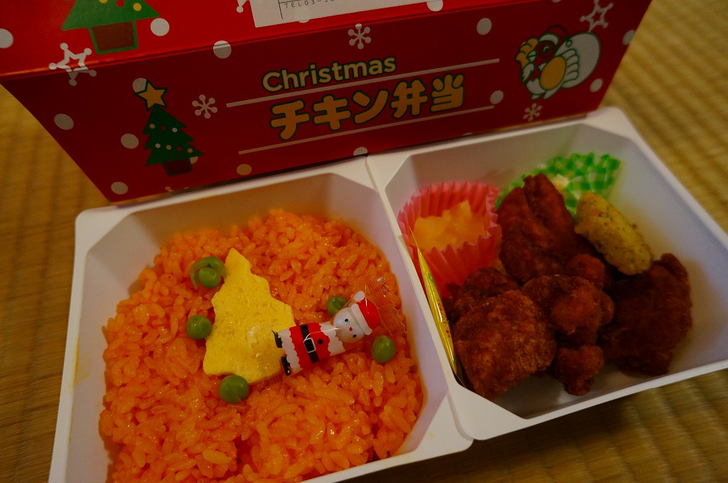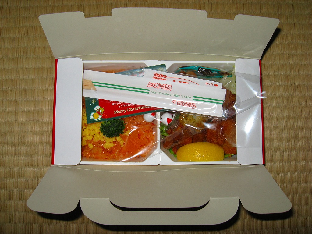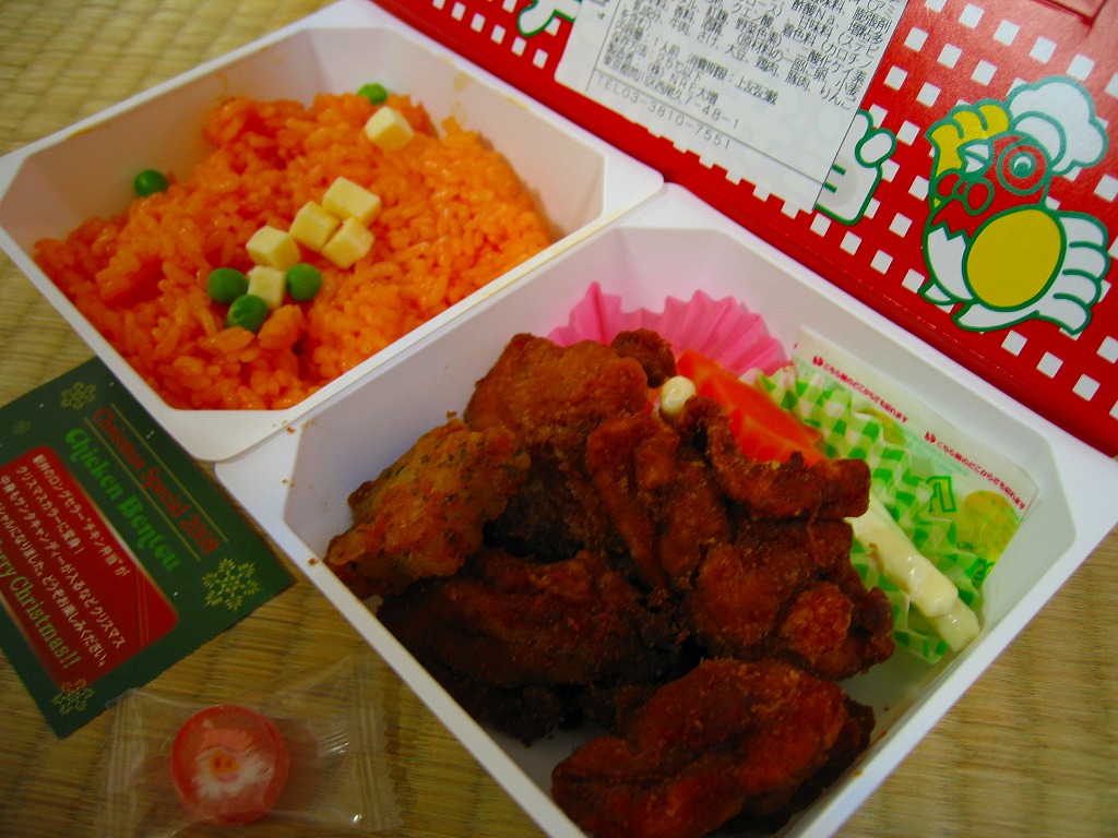 チキン弁当クリスマスバージョンの2010(平成22)年版で、今回は10日から25日までの販売。買いそびれた2009年版では、チキンライスの上に振るチーズがクリスマスツリー型の玉子焼に変わり、今回はサンタクロース顔の金太郎飴がパチンコ玉の大きさのチョコレート2個に変わり、パッケージの背景がチェック柄から雪空?に変わり、クリスマスカードの添付がなくなった。