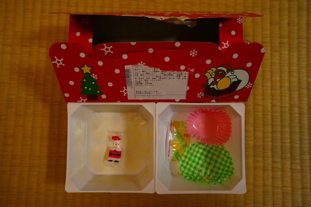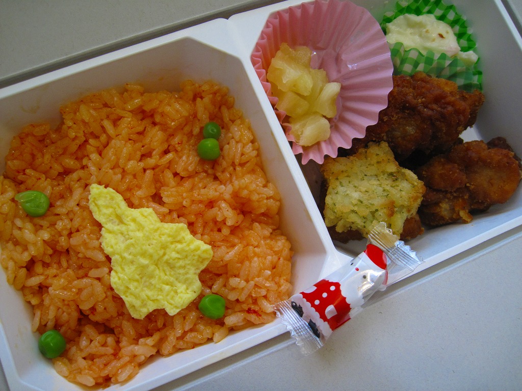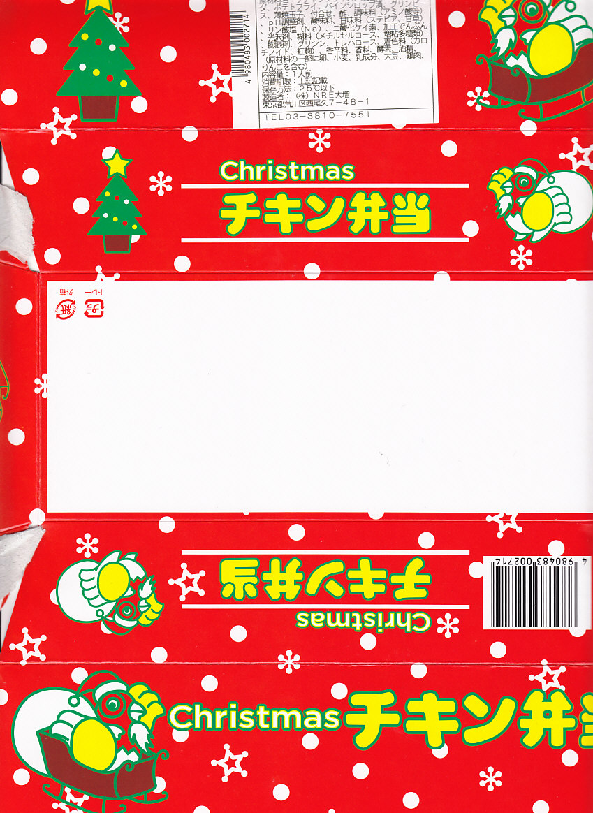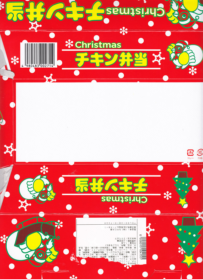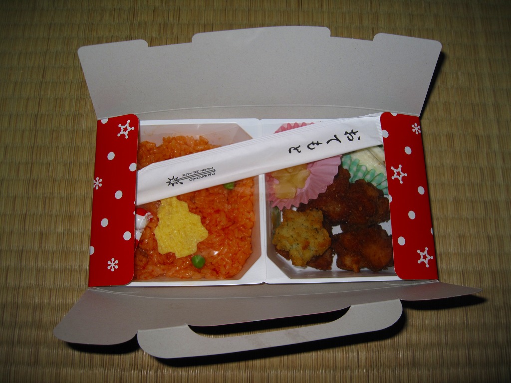 チキン弁当クリスマスバージョンの2010(平成22)年版で、今回は10日から25日までの販売。買いそびれた2009年版では、チキンライスの上に振るチーズがクリスマスツリー型の玉子焼に変わり、今回はサンタクロース顔の金太郎飴がパチンコ玉の大きさのチョコレート2個に変わり、パッケージの背景がチェック柄から雪空?に変わり、クリスマスカードの添付がなくなった。