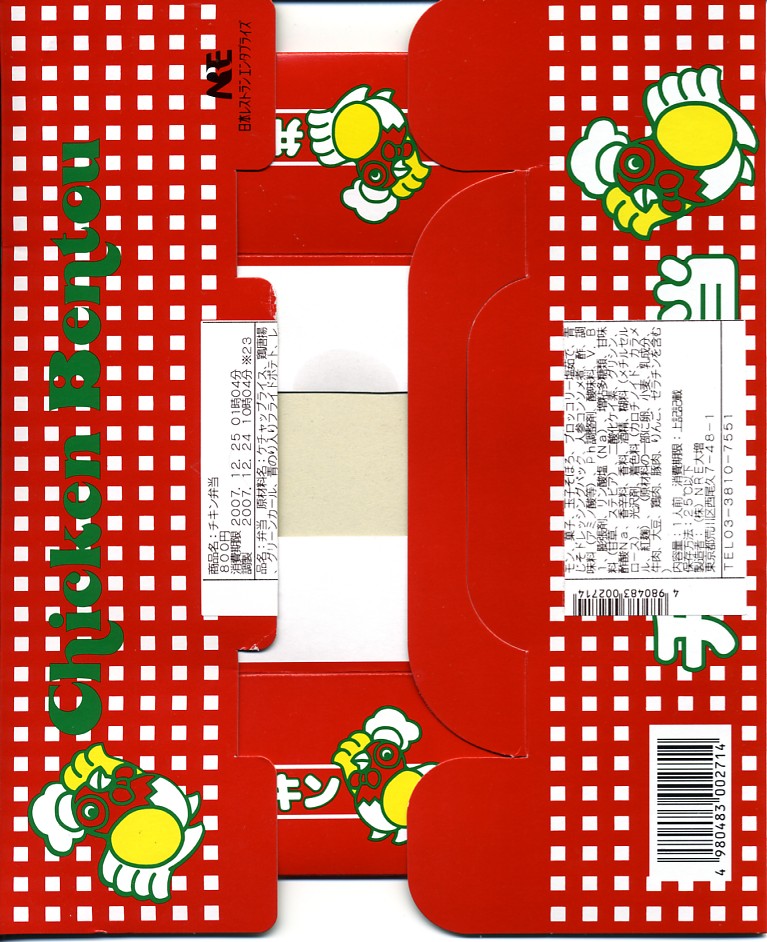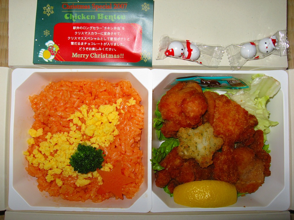チキン弁当クリスマスバージョンの2007(平成19)年版で、今回は12月15日から25日までの販売。前回との差異は、チキンライスのグリーンピースをブロッコリーと星形のニンジンに差し替えたことと、添付のチョコレートが角形から丸形に変わったこと。これが売られている期間は、通常版は購入できない。