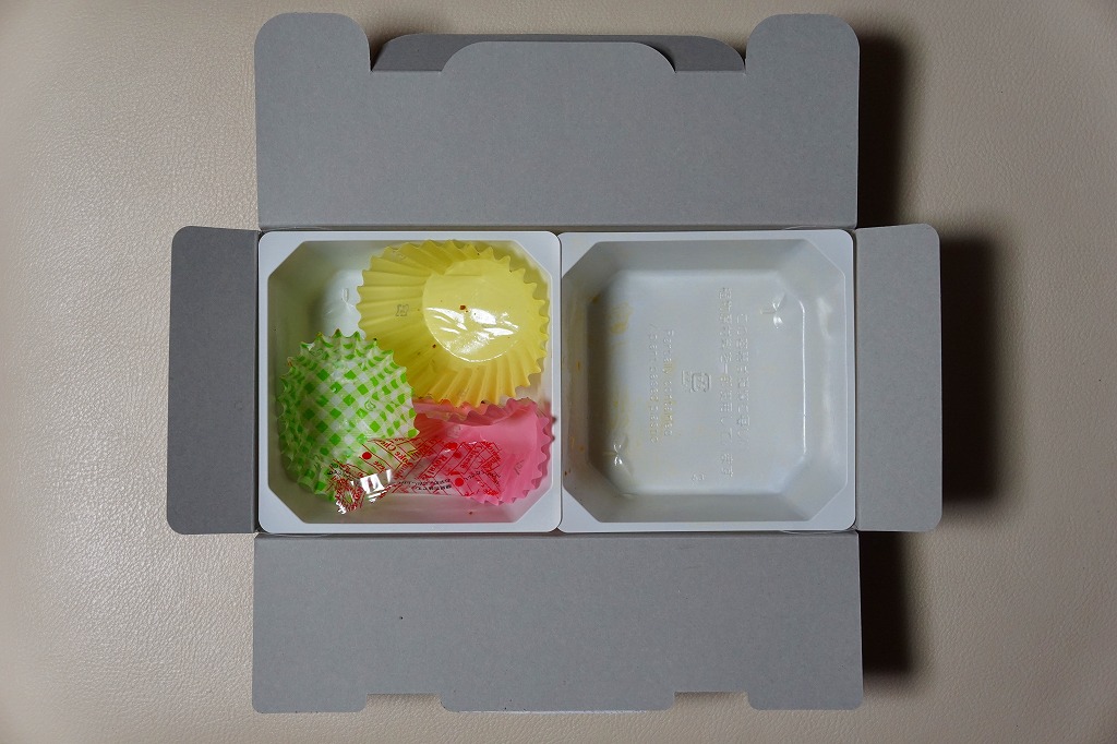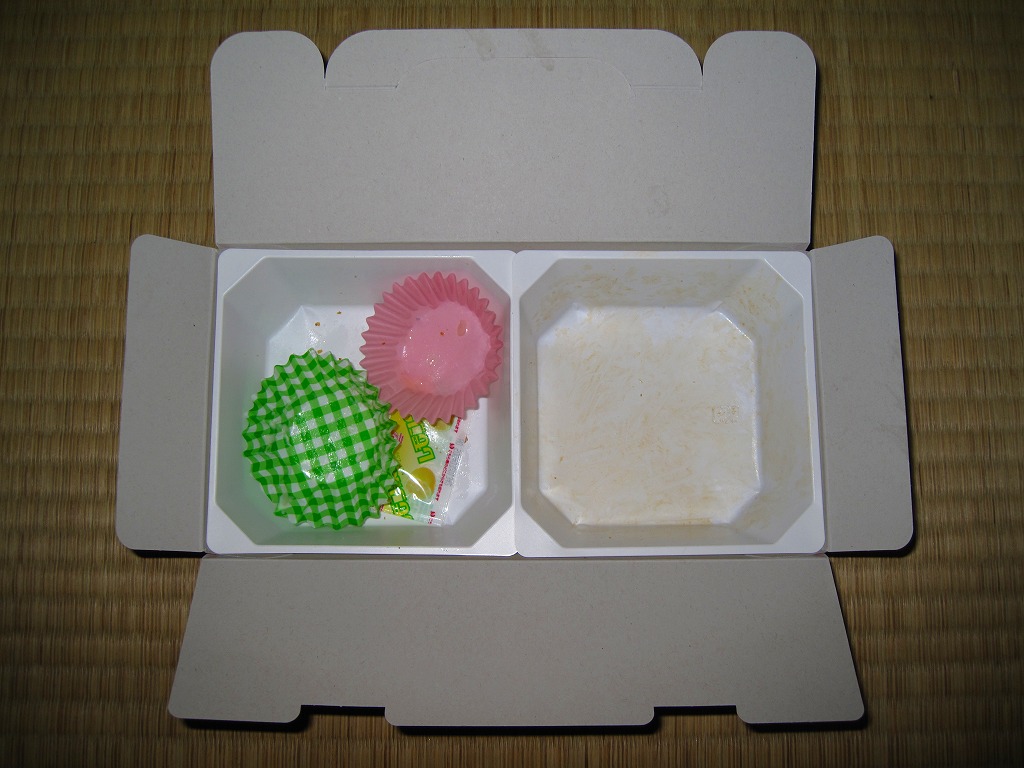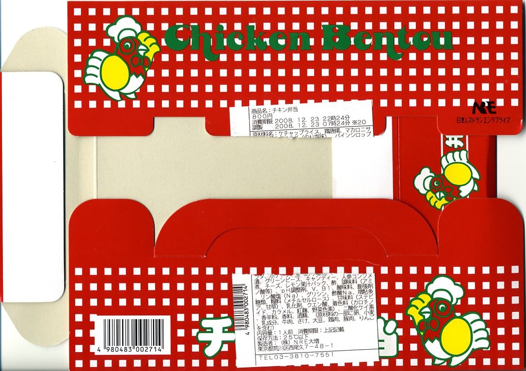 袋の絵柄はチキン弁当の箱に揃えた。玉子そぼろ入りトマト風味ライスに、鶏唐揚とドライトマトオイル漬を貼り付けたもの1個を袋詰め。その内容と風味はまさしく、東京駅弁「チキン弁当」のものであった。これならニューデイズならではの商品として、一年中買えてもよいと思う。チキン弁当をコンビニ弁当の見た目と大きさと値段で販売した実績があったはず。