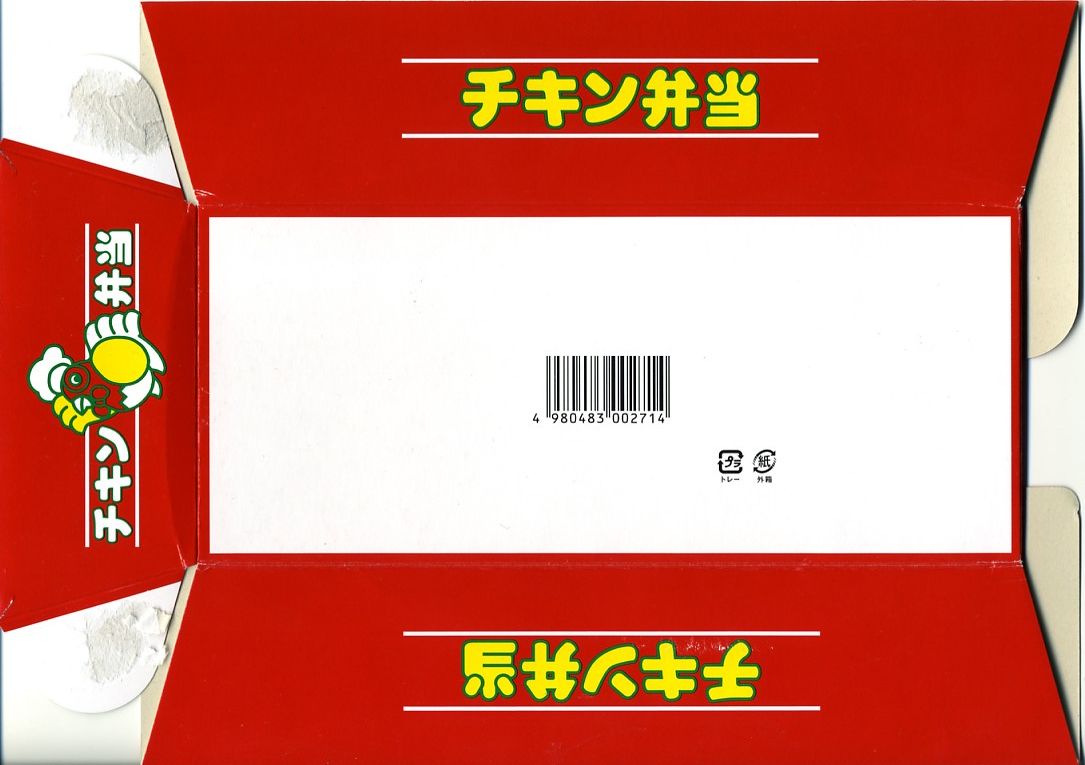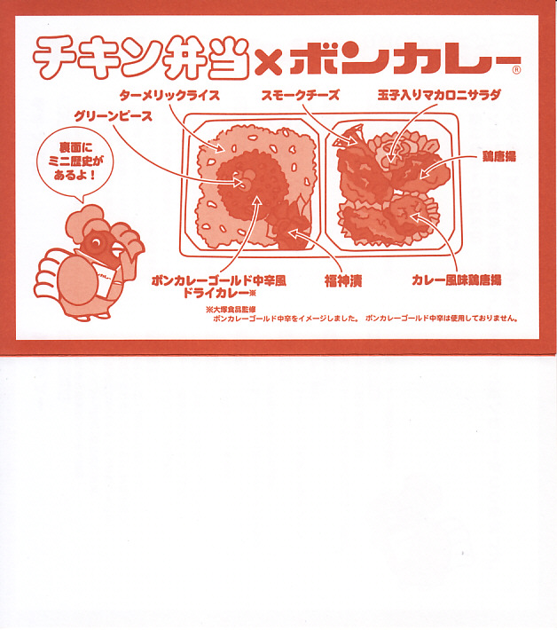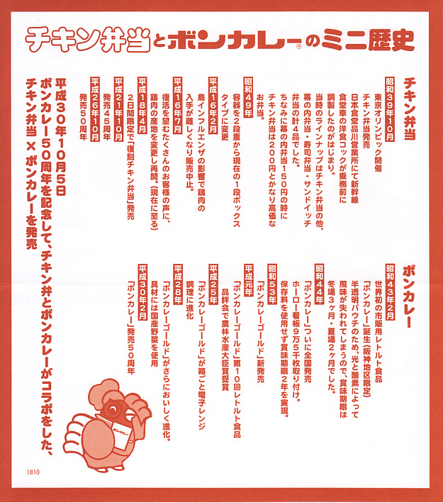 中身はケチャップライスに降りかかる卵がニワトリ型になった以外は、この時点での通常版と同じで、おかずは鶏唐揚とポテトサラダとスモークチーズとレモン汁。添付の年表「チキン弁当のミニ歴史」は、また内容が詳しくなった。