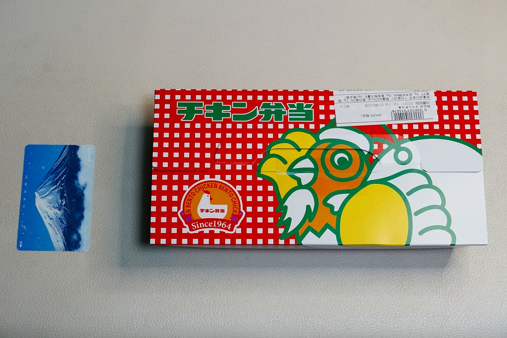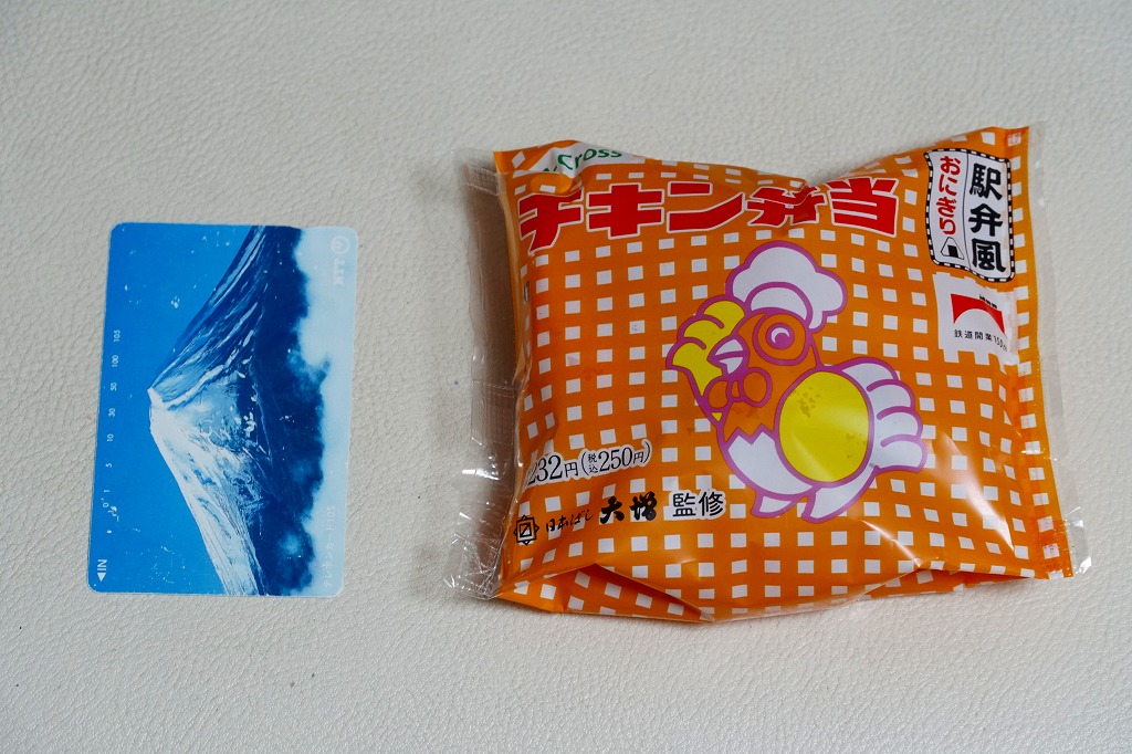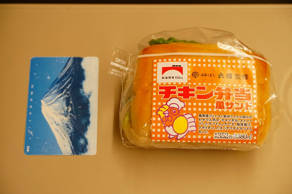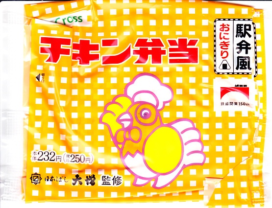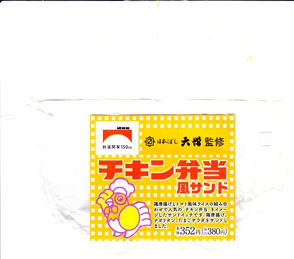 これは東京駅弁の日本ばし大増が監修し、埼玉県のJR東日本クロスステーションが製造し、駅のコンビニで販売する、自社完結の企画商品。ピタサンド向けのような食感のパンに、鶏唐揚、スパゲティナポリタン、たまごサラダ、レタスを挟んだ。中身はやや違えど、確かに駅弁のチキン弁当のような味。シールには鉄道開業150年のJRグループ共通ロゴに、あの名無しのニワトリが描かれた。2023年10月にも販売。以後は出ていない。