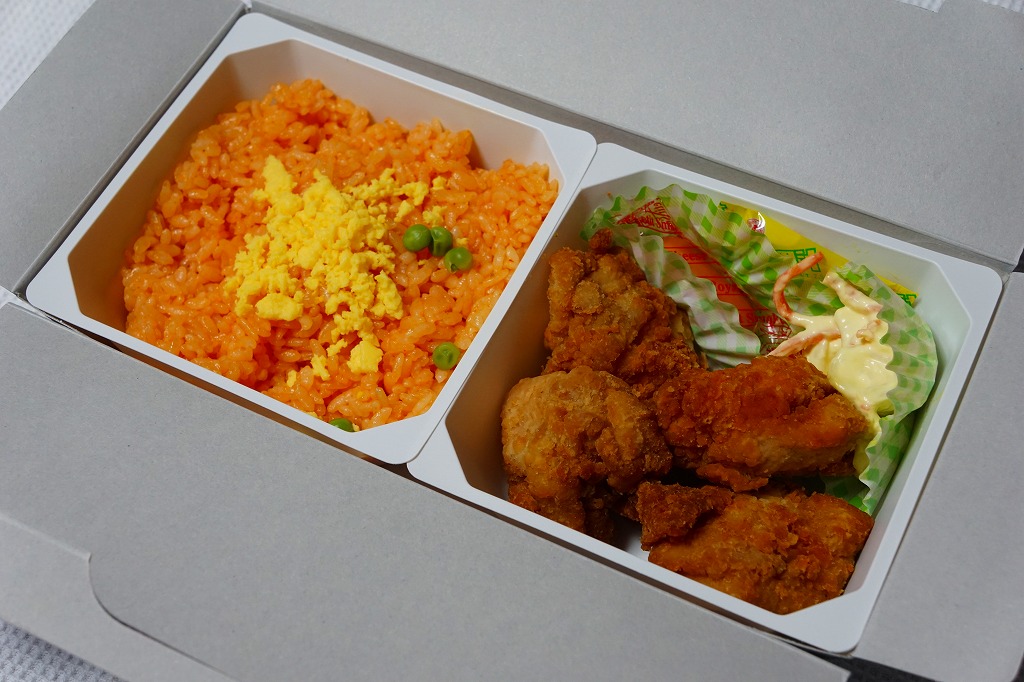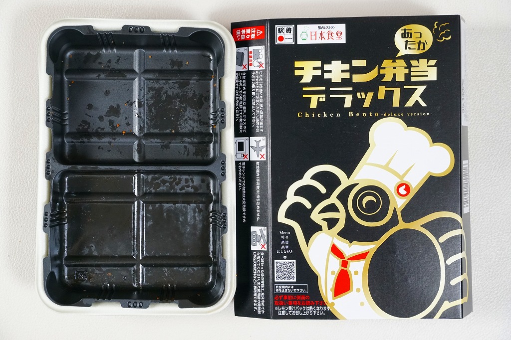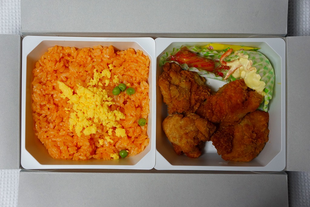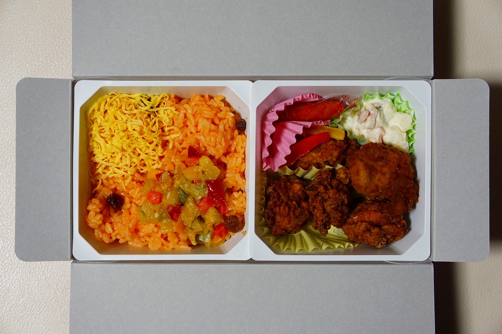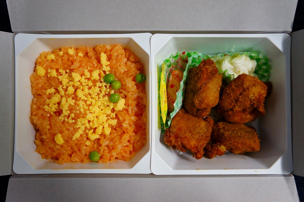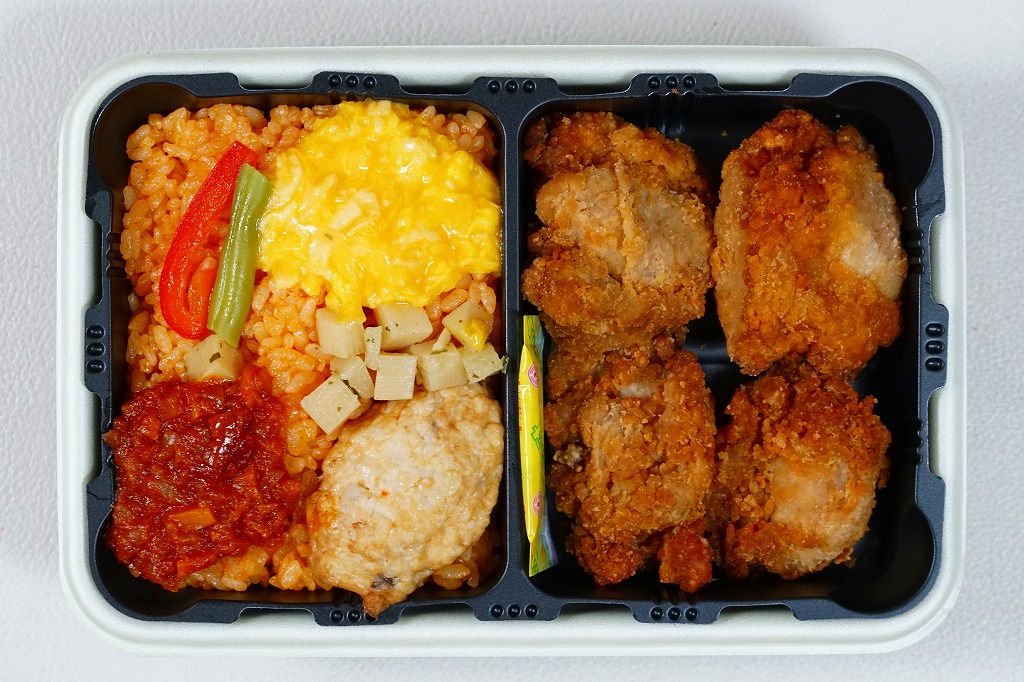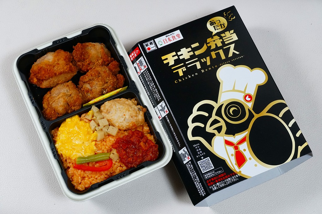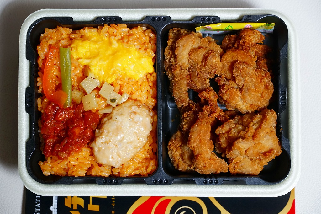 中身の2区画は、一方に鶏唐揚とレモン果汁パック、他方にトマト風味ライスを詰めて、スクランブルエッグ、タマネギとニンジン入りトマトソース、軟骨入り鶏つくね、いんげん、パプリカ、筍煮のバジルソース添えで覆うもの。加熱して食べれば、いつもの常温のチキン弁当と同じような、昔懐かしいタイプのざらついた風味。この風味を出すために味付けは通常版から変えたと紹介されている。加熱機能付き容器のチキン弁当は初めて出したとなると、逆に60年間、このチキン弁当は温めずに食べられてきて人気だったという事実。駅弁売店ではあまり売れていないように感じたが、どうだろうか。