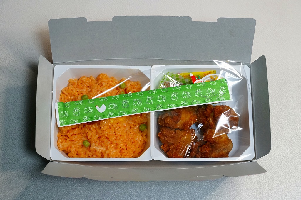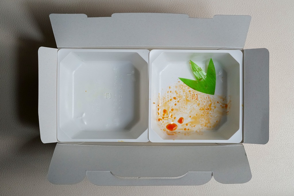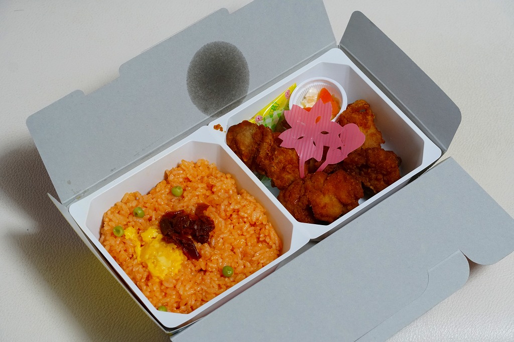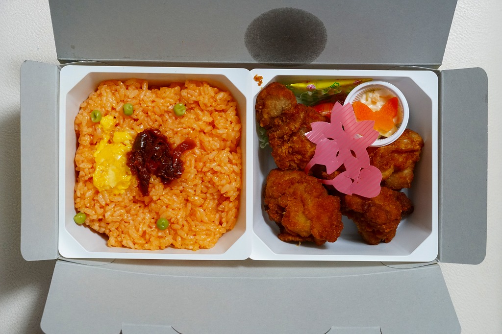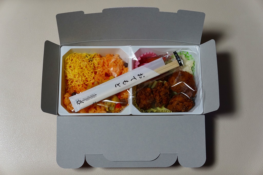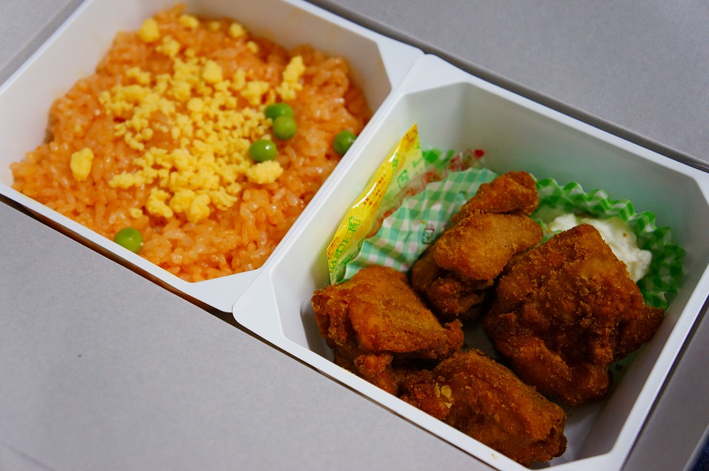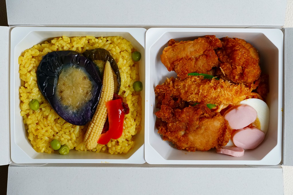 中身の2区画は、一方に鶏唐揚とレモン果汁パック、他方にトマト風味ライスを詰めて、スクランブルエッグ、タマネギとニンジン入りトマトソース、軟骨入り鶏つくね、いんげん、パプリカ、筍煮のバジルソース添えで覆うもの。加熱して食べれば、いつもの常温のチキン弁当と同じような、昔懐かしいタイプのざらついた風味。この風味を出すために味付けは通常版から変えたと紹介されている。加熱機能付き容器のチキン弁当は初めて出したとなると、逆に60年間、このチキン弁当は温めずに食べられてきて人気だったという事実。駅弁売店ではあまり売れていないように感じたが、どうだろうか。