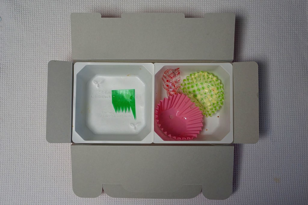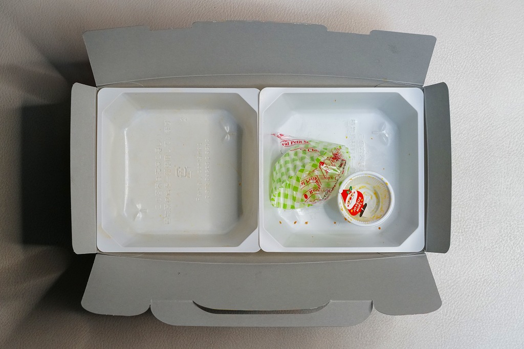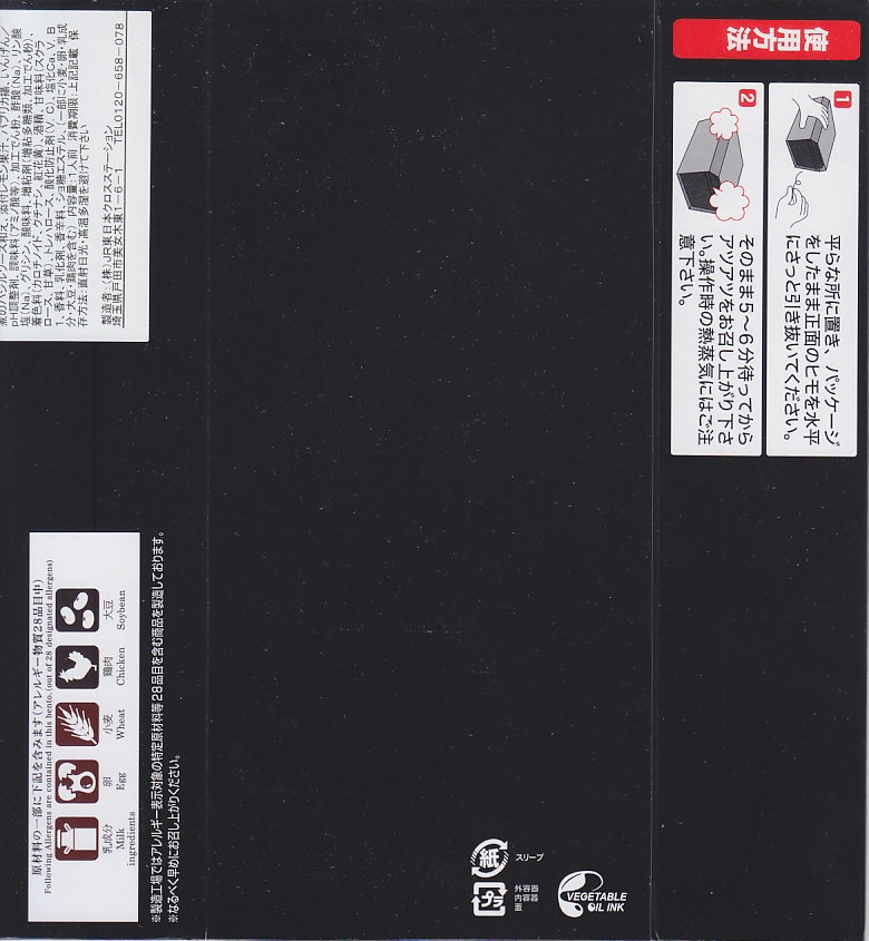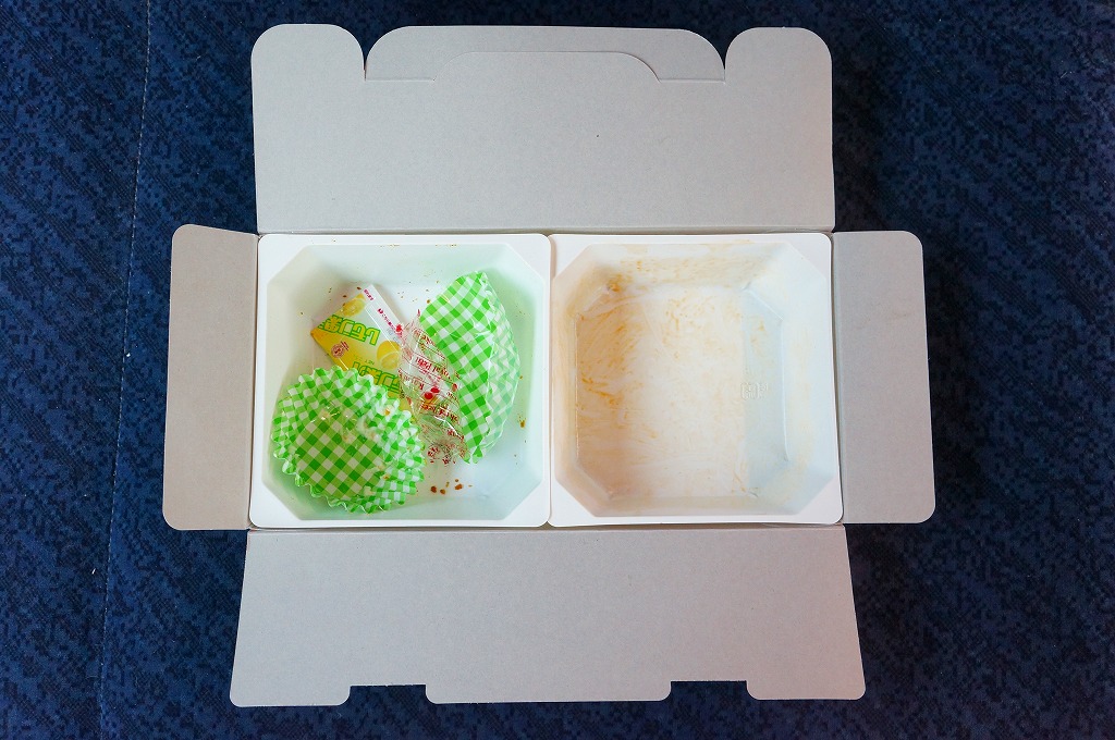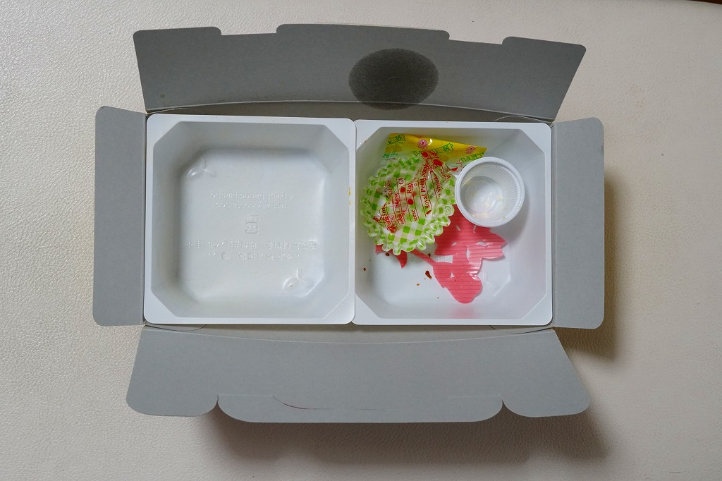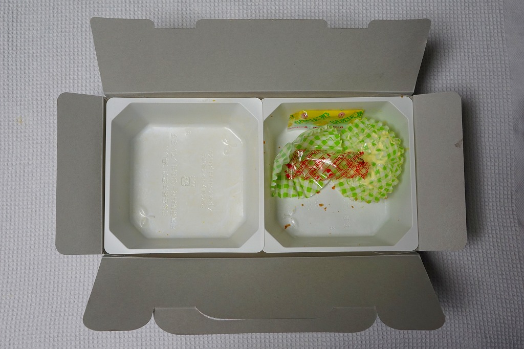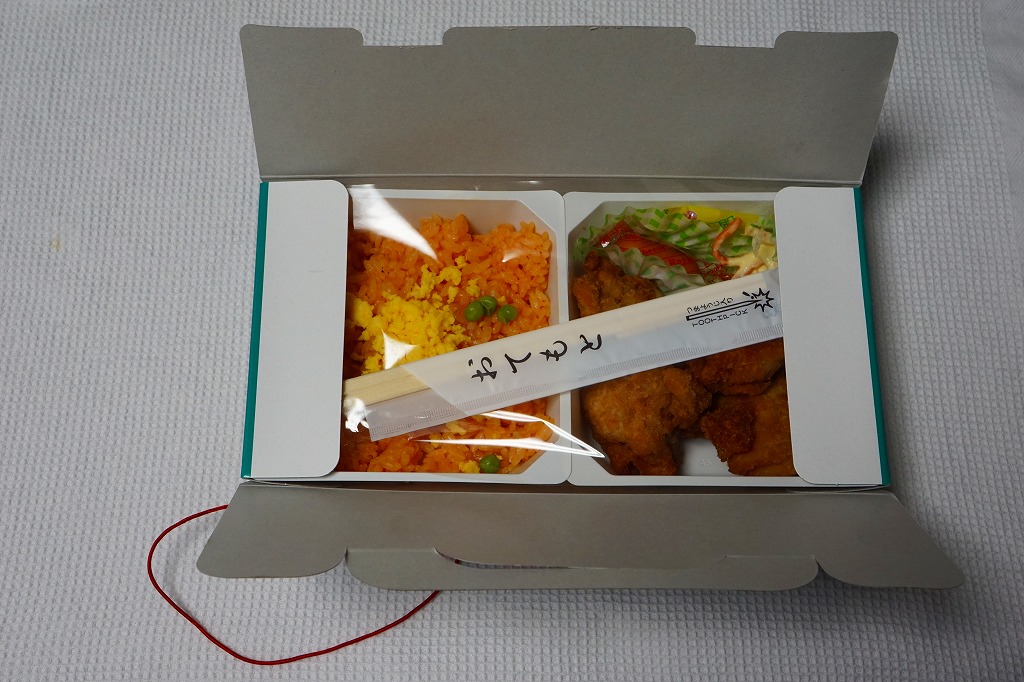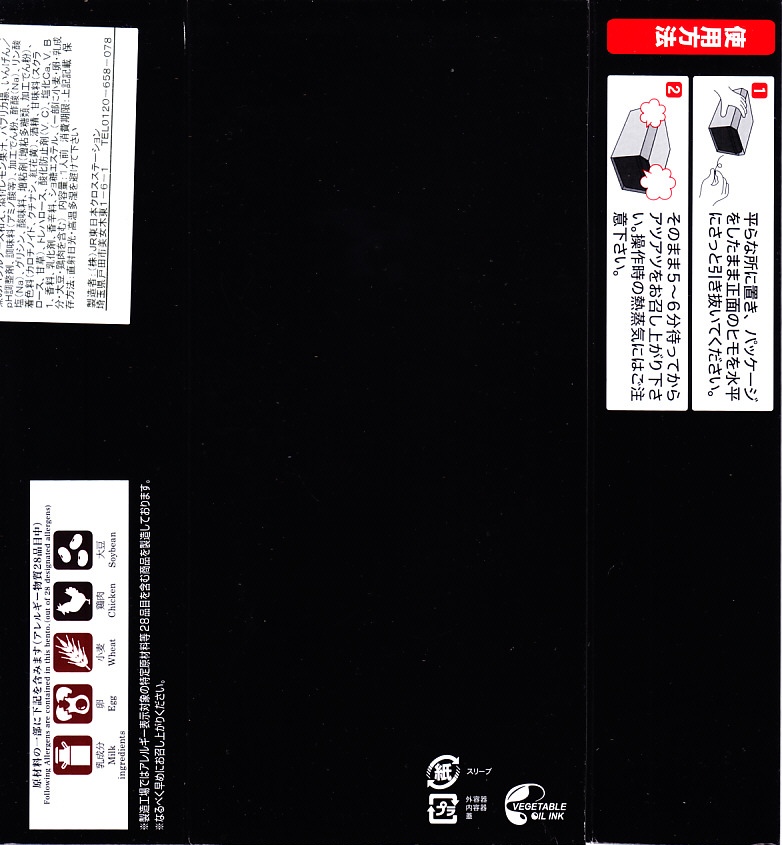 中身の2区画は、一方に鶏唐揚とレモン果汁パック、他方にトマト風味ライスを詰めて、スクランブルエッグ、タマネギとニンジン入りトマトソース、軟骨入り鶏つくね、いんげん、パプリカ、筍煮のバジルソース添えで覆うもの。加熱して食べれば、いつもの常温のチキン弁当と同じような、昔懐かしいタイプのざらついた風味。この風味を出すために味付けは通常版から変えたと紹介されている。加熱機能付き容器のチキン弁当は初めて出したとなると、逆に60年間、このチキン弁当は温めずに食べられてきて人気だったという事実。駅弁売店ではあまり売れていないように感じたが、どうだろうか。