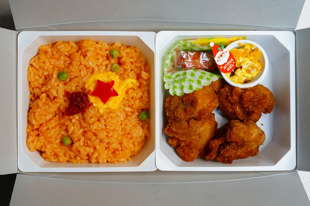 2021(令和3)年12月に販売された、チキン弁当クリスマスバージョン。2013(平成25)年12月以来8年ぶりのチキン弁当クリスマス版というが、10年ぶりくらいに見た気がする。今回は箱の絵柄が通常版に似ていて、肝心のサンタ帽が食品表示ラベルに隠れたため、様々な駅弁を満載する売店では遠目で変化に気が付かなかった。中身もケチャップライスと鶏唐揚の構造に変化がないばかりか、卵に星が載り、カップのピクルスがカボチャに替わりサンタの付箋を付けたくらいで、通常版とほぼ変化がない。売り場によってはこれでなく、通常版のチキン弁当を販売した。