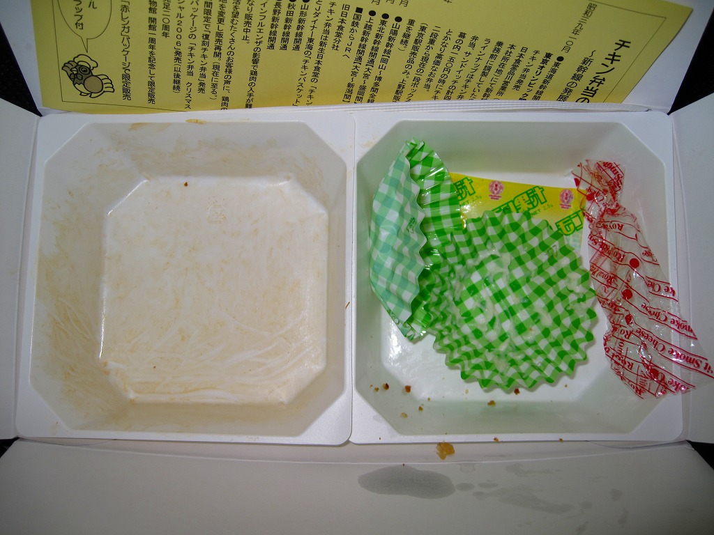 鳥唐揚やチキンライスの人気で時代遅れな味は健在。簡単な手入れで特別版を名乗るチープさにもまた泣けるが、これがチキン弁当の魅力そのものである。この年は復刻版も出ており、NRE社内でもようやくこの駅弁の人気と実力に気が付いてもらったようだ。
