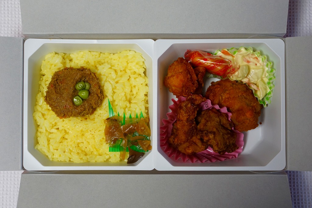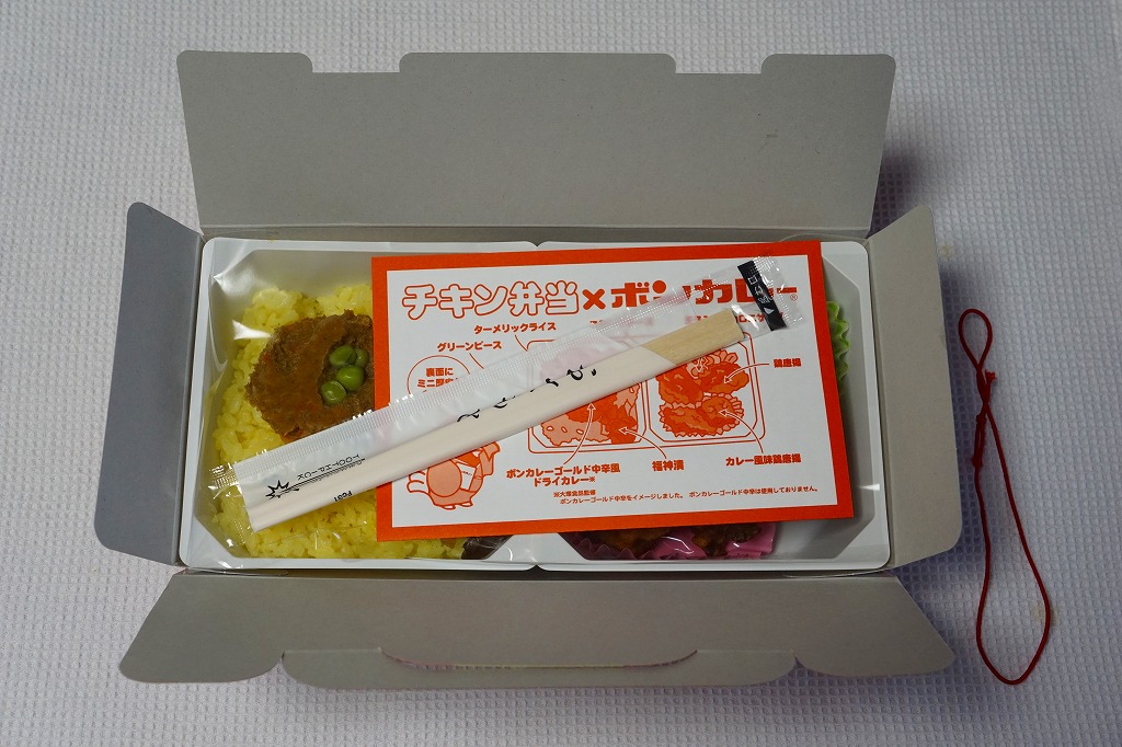いつものチキン弁当のバスケット型紙箱に、ボンカレーの名前と三重丸の黄色いマークが描かれる。中身は一方でカレーペーストと福神漬をターメリックライスに載せ、他方で通常版とカレー風味の鶏唐揚に玉子入マカロニサラダとスモークチーズを詰める。ボンカレーの味は個人的にあまり好みでないのだが、このドライカレーはおいしかった。パッケージに「ボンカレーゴールド中辛は使用しておりません」と明記される。2か月間の販売か。