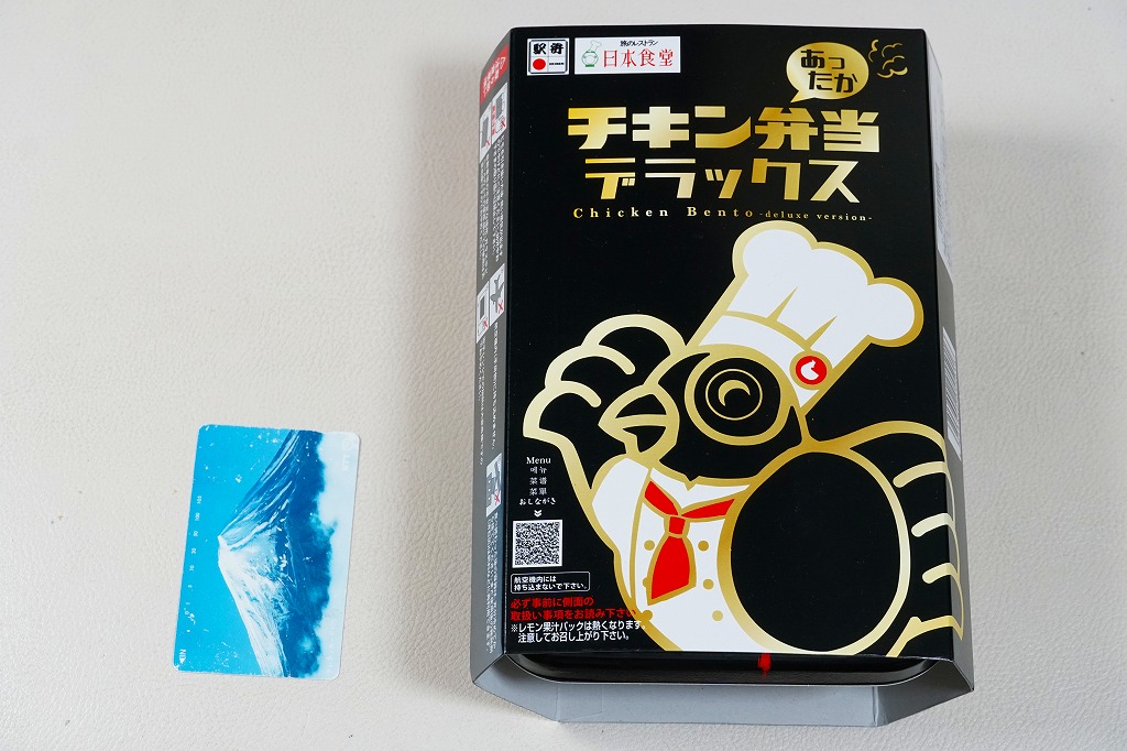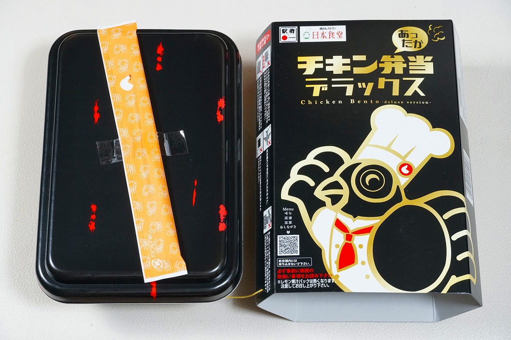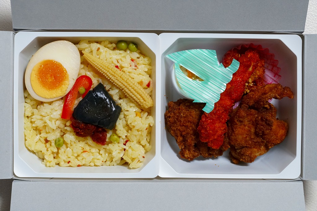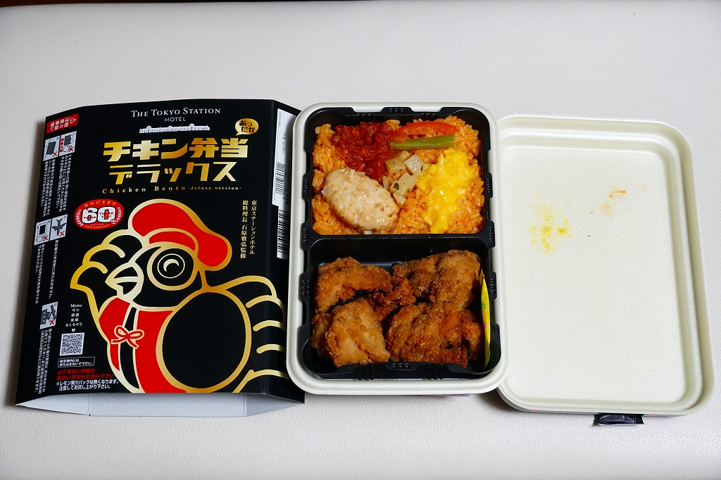 見た目のとおり、実物の実態も東京駅弁の名作「チキン弁当」の特別版。容器の配色がワイン色になり、あの鳥が兜をつけて馬に乗り、チキンライスに錦糸卵や干しぶどうや野菜ソテーを載せ、色が濃くなった鶏唐揚には味噌味と醤油味があり、いつものものとは違う香りや強めの味付けを持っていた。通常版のチキン弁当も併売。
