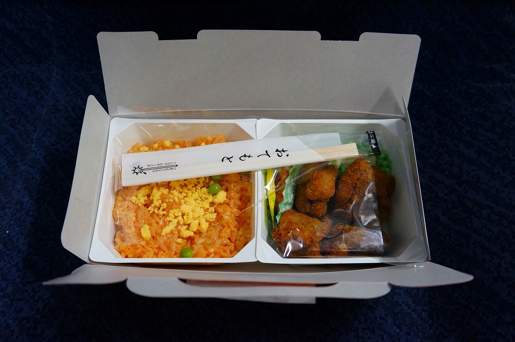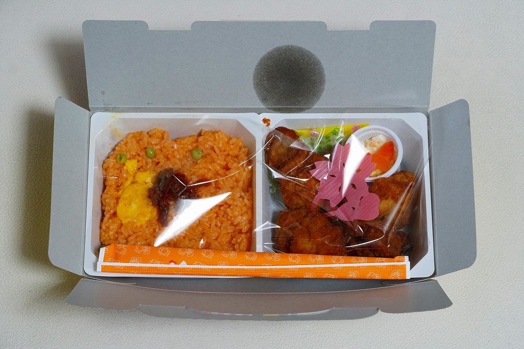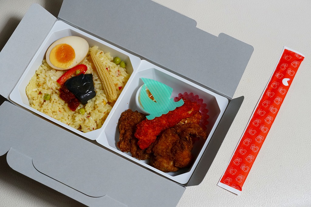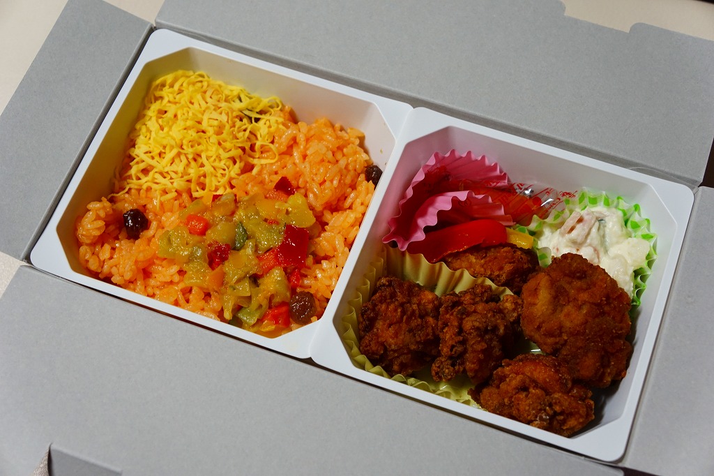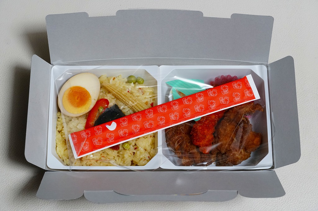 見た目のとおり、実物の実態も東京駅弁の名作「チキン弁当」の特別版。容器の配色がワイン色になり、あの鳥が兜をつけて馬に乗り、チキンライスに錦糸卵や干しぶどうや野菜ソテーを載せ、色が濃くなった鶏唐揚には味噌味と醤油味があり、いつものものとは違う香りや強めの味付けを持っていた。通常版のチキン弁当も併売。