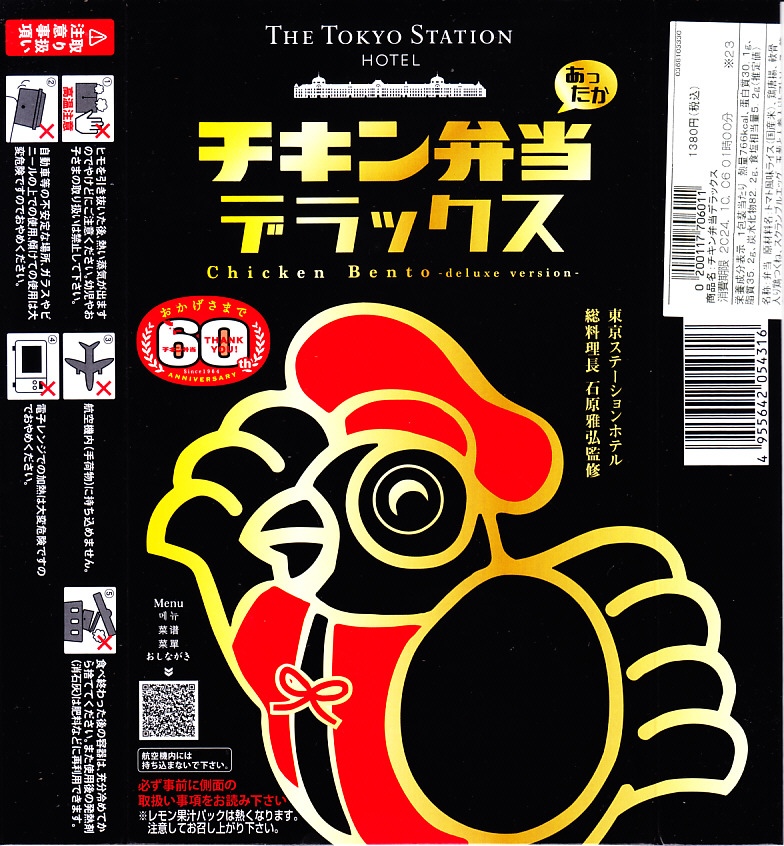 2024(令和6)年10月1日に、東京、新宿、上野、大宮の各駅で発売。2025年3月まで販売する予定とされたが、4月以降も販売中。10月のJR東日本の駅弁キャンペーン「駅弁味の陣2024」へエントリー。1964年10月1日発売の東京駅弁「チキン弁当」の発売60周年を記念し、東京ステーションホテルの総料理長が監修する、特別なチキン弁当を販売した。長方形の加熱機能付き容器をはめたスリーブは真っ黒で、チキン弁当でおなじみのニワトリのイラストを大きく、商品名やホテルのマークや注意書きとともに描く。