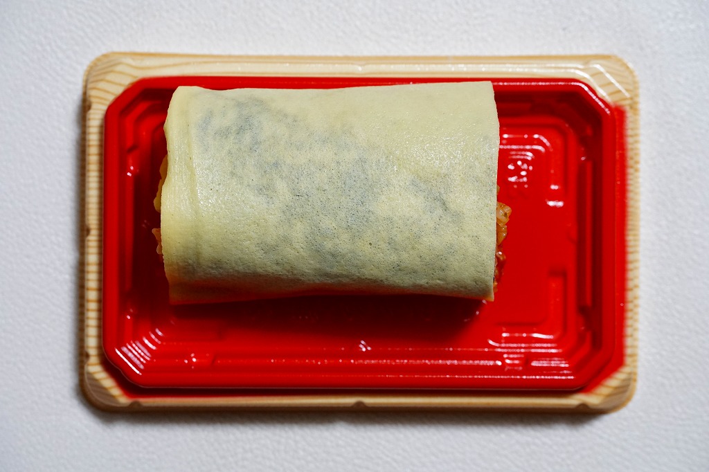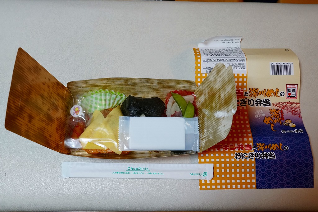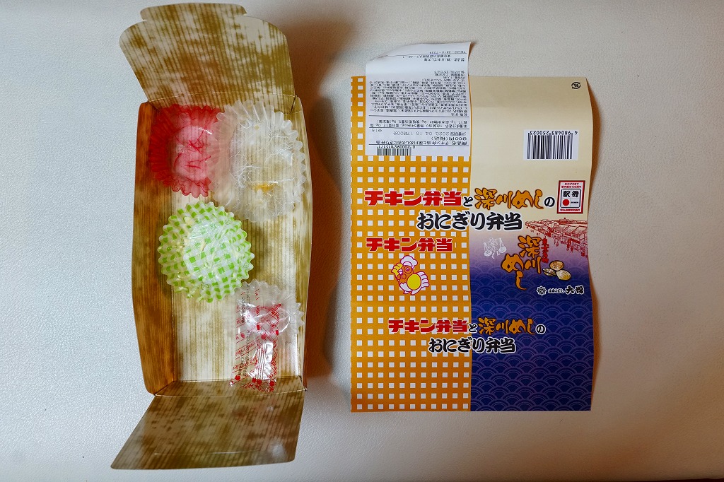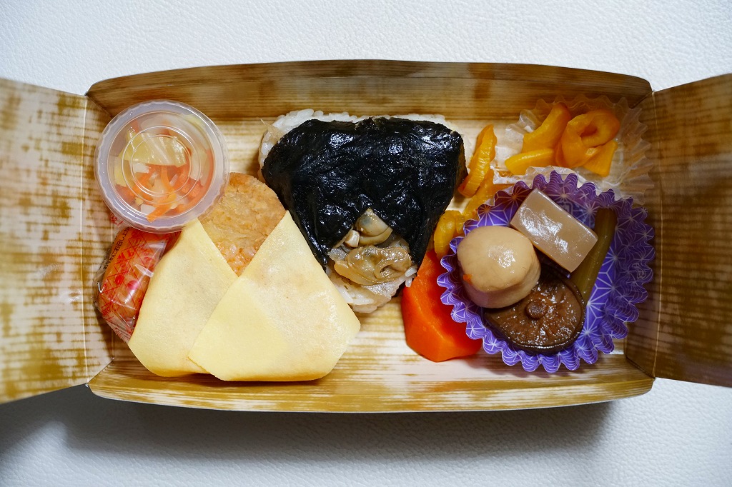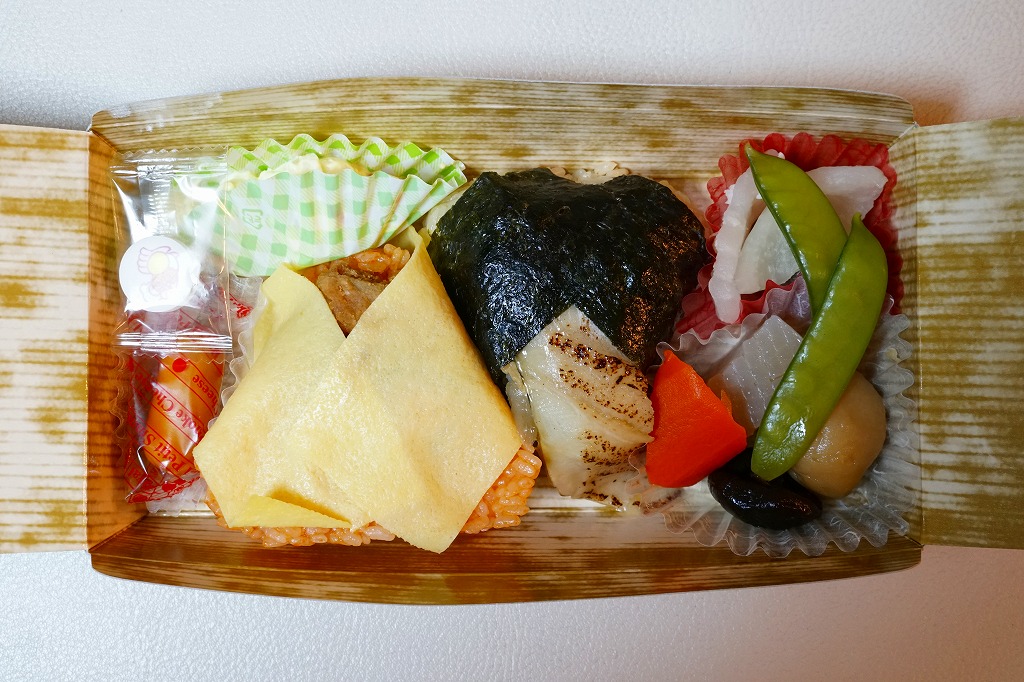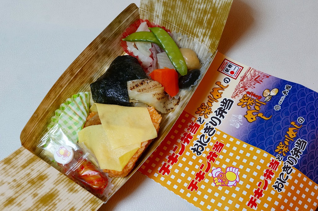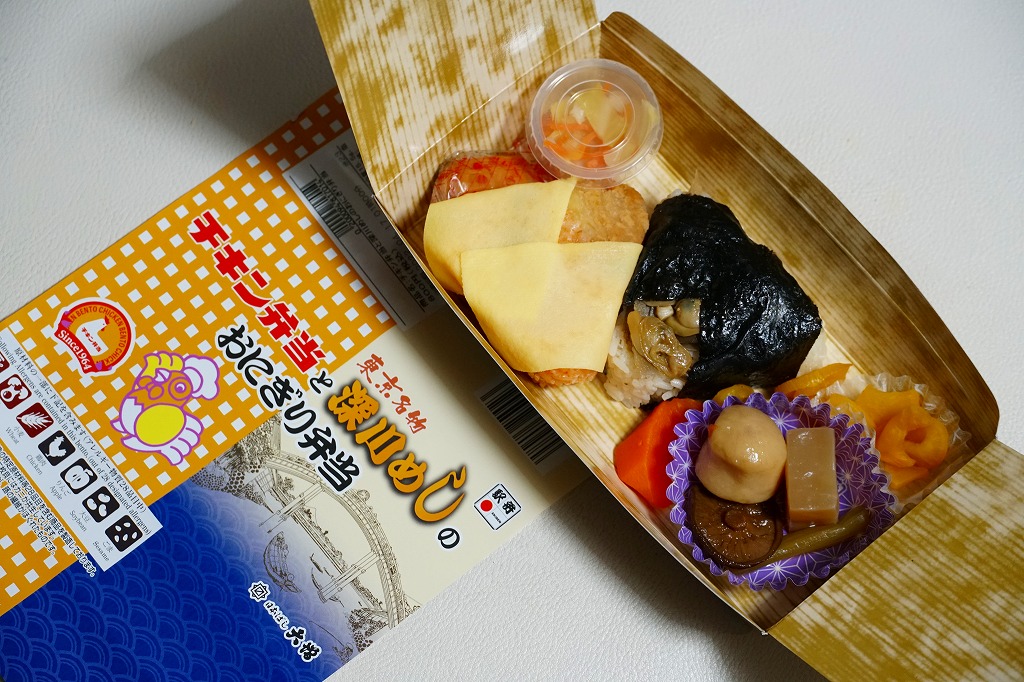 竹皮柄の紙容器に巻いた掛紙は、東京駅で人気かつ有名かつ伝統の駅弁「チキン弁当」のパッケージや「深川めし」のスリーブの絵柄でできている。中身もまたその組合せで、チキンライスを玉子焼で巻くおむすび、穴子を海苔で巻くおむすび、ポテトサラダにチーズにラムネ、煮物に漬物で、これも両者の通常版を足して2で割った感じ。だから通常版のおいしさ。